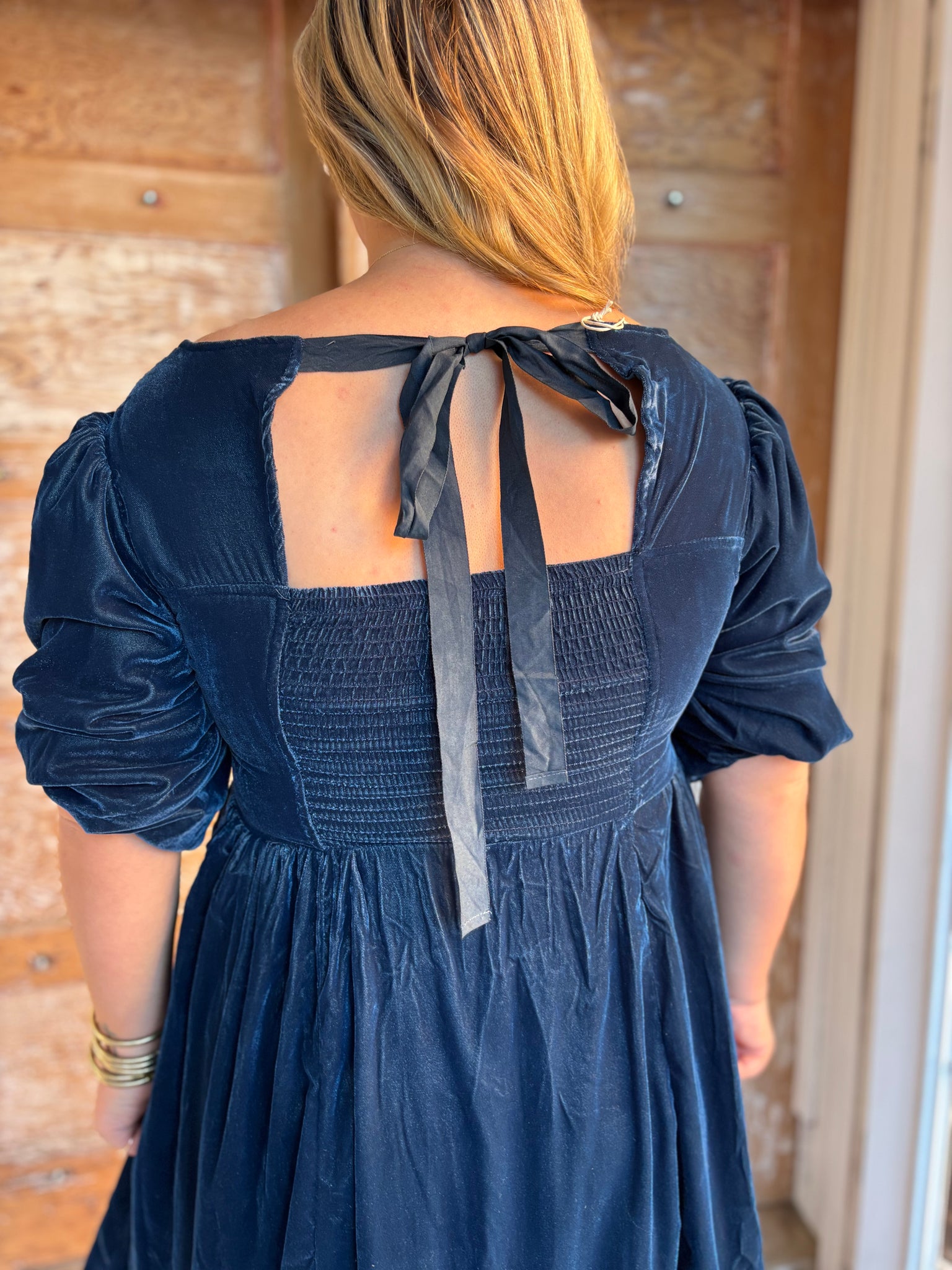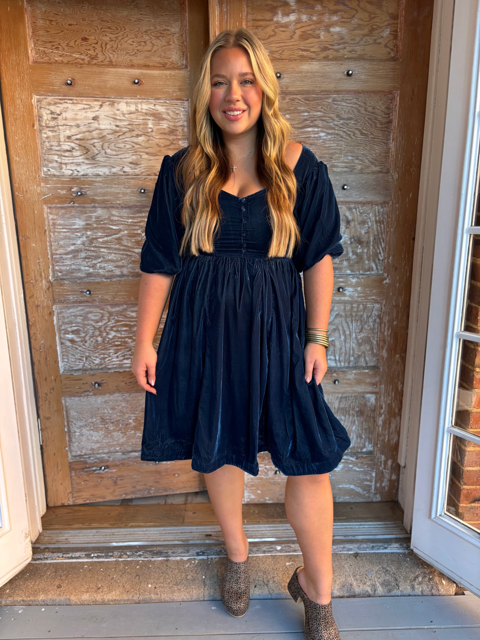 VELVET MINI DRESS FEATURING: - SWEETHEART NECKLINE - PRINCESS SEAMS - NON FUNCTIONAL BUTTON ACCENTS - CONCEALED SIDE ZIPPER - PUFF SLEEVES - PARTIAL SMOCKED BACK WITH SELF TIE RIBBON KEYHOLE - FULLY LINED