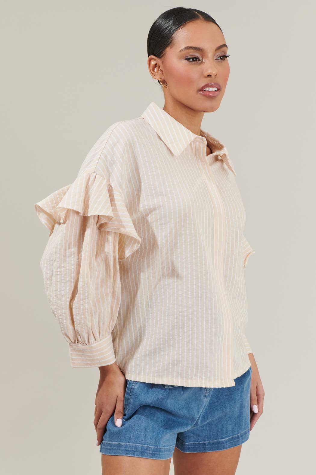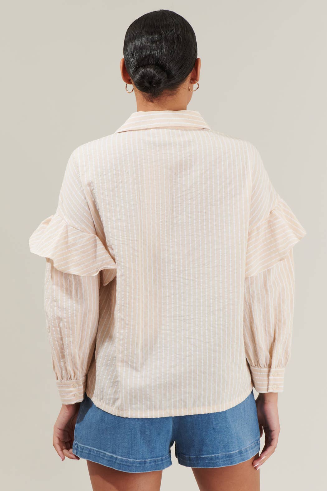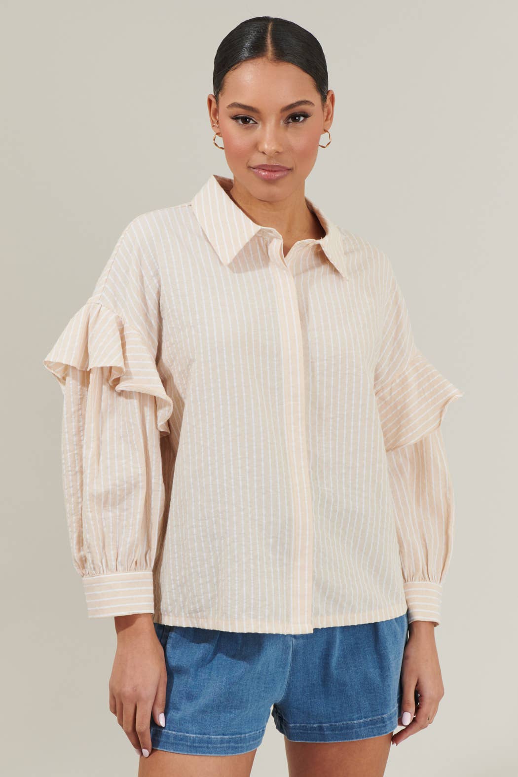 Elevating your everyday look is as easy as adding the Elliott Striped Button-Down Shirt! A dropped shoulfer with ruffles shape balloon long sleeves with button cuffs that frame a collared neckline. Bodice boasts a functional button placket. Wear it open or button down and make it your style! - Button down - Long sleeves - Ruffle detail - Striped - Color: Oatmeal Size + Fit - Model is 5'8" and wearing size XS - Measurements taken from size S - Chest: 21 3/4" - Length: 24 1/2"