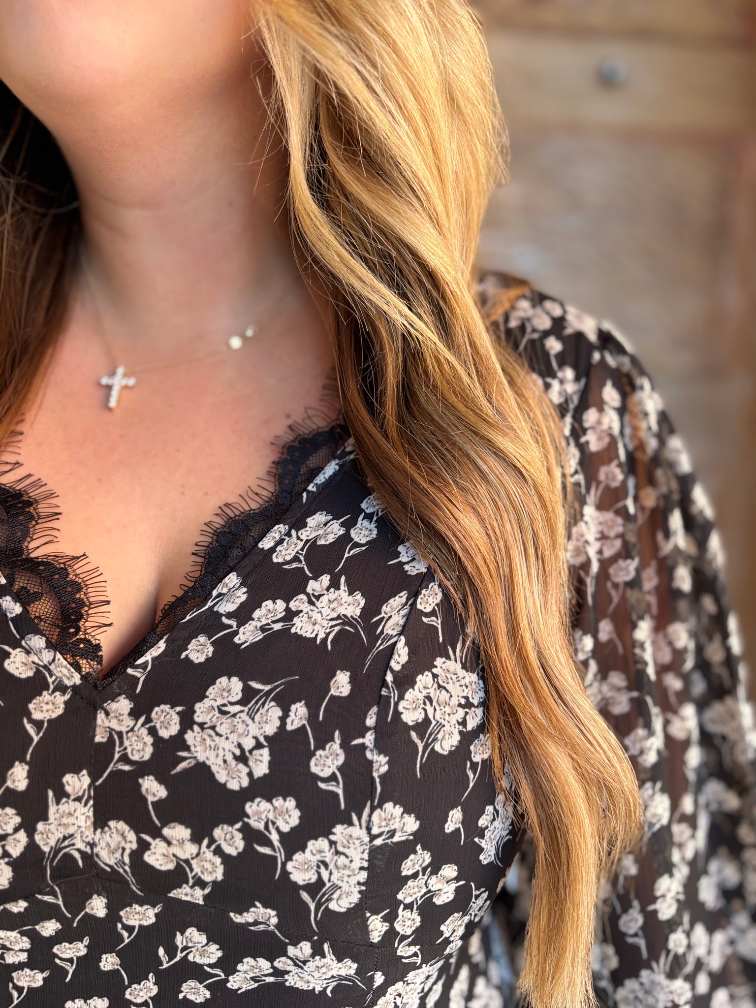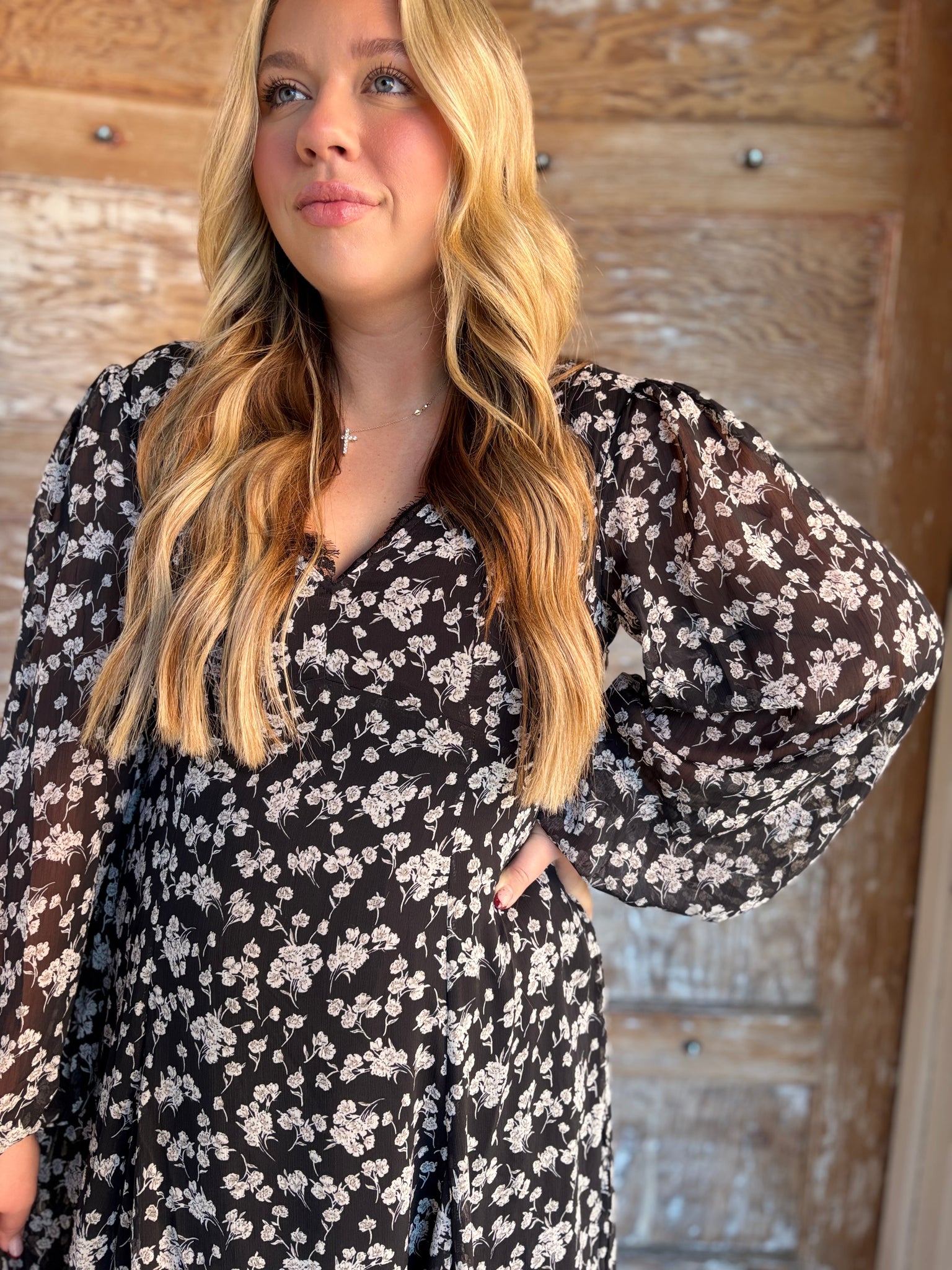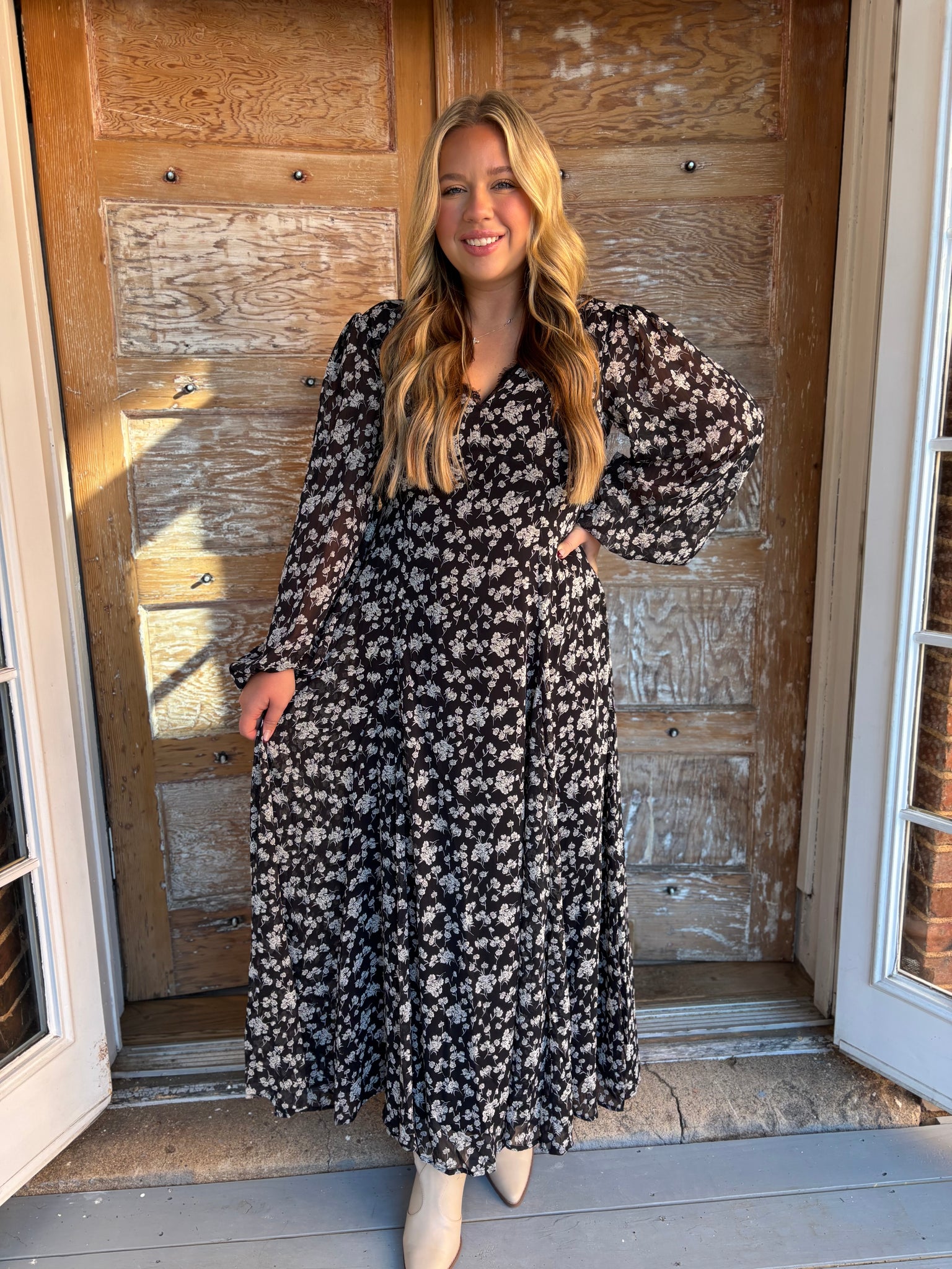Effortlessly romantic and beautifully timeless, the Luna Bloom Maxi is designed to make every moment feel a little more enchanting. This flowing black maxi dress features an allover ivory floral print that adds a soft, feminine touch while maintaining an elegant, understated vibe.