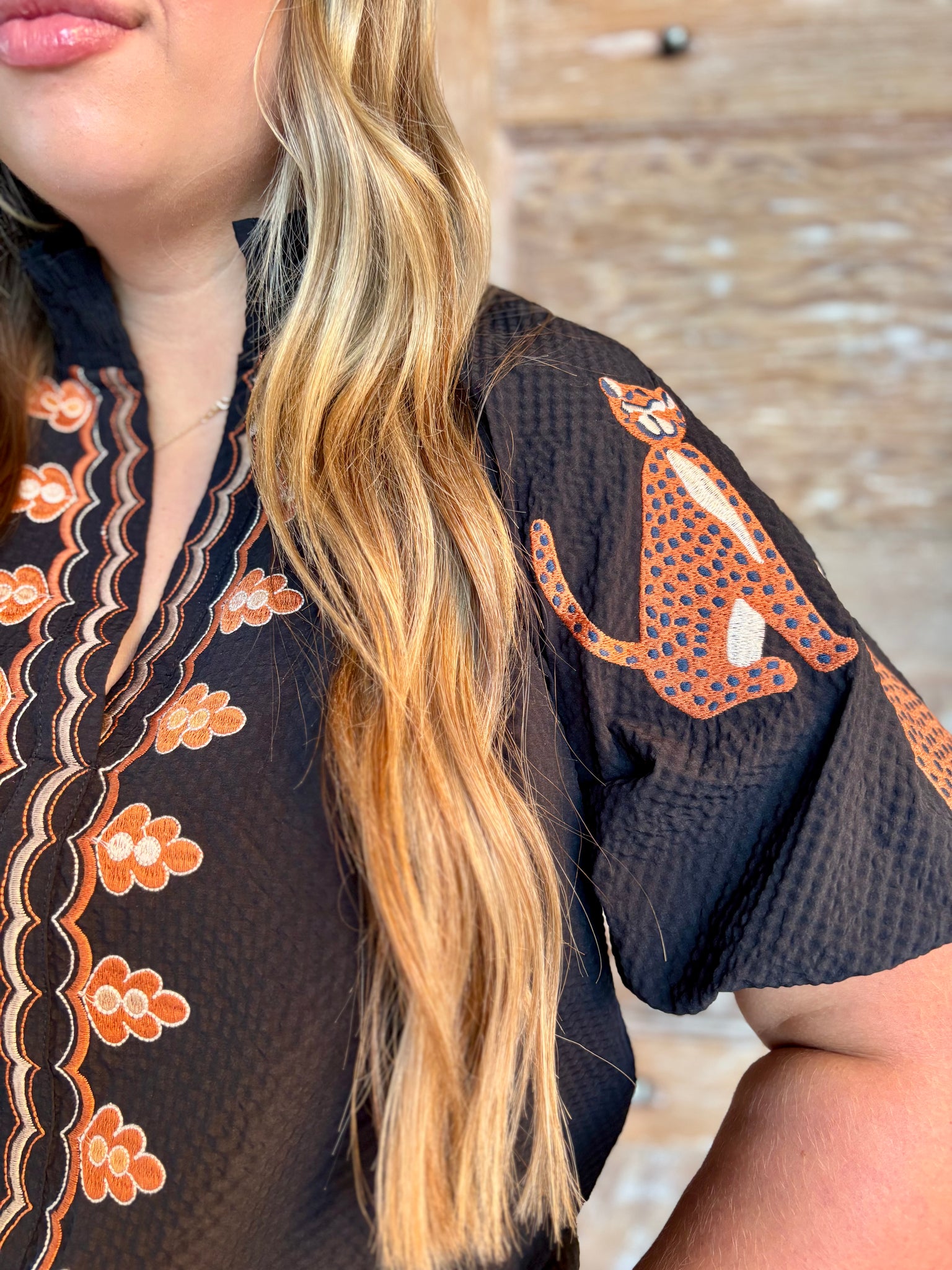Chic meets playful in our Cat Embroidery Top! This black textured blouse features beautifully detailed camel embroidery along the puff sleeves, adding a touch of charm and craftsmanship to your look. The soft textured fabric gives it a rich feel, while the statement sleeves make it effortlessly stylish for any occasion. Pair it with jeans for a casual day out or dress it up with a skirt and boots for a trendy fall fit.