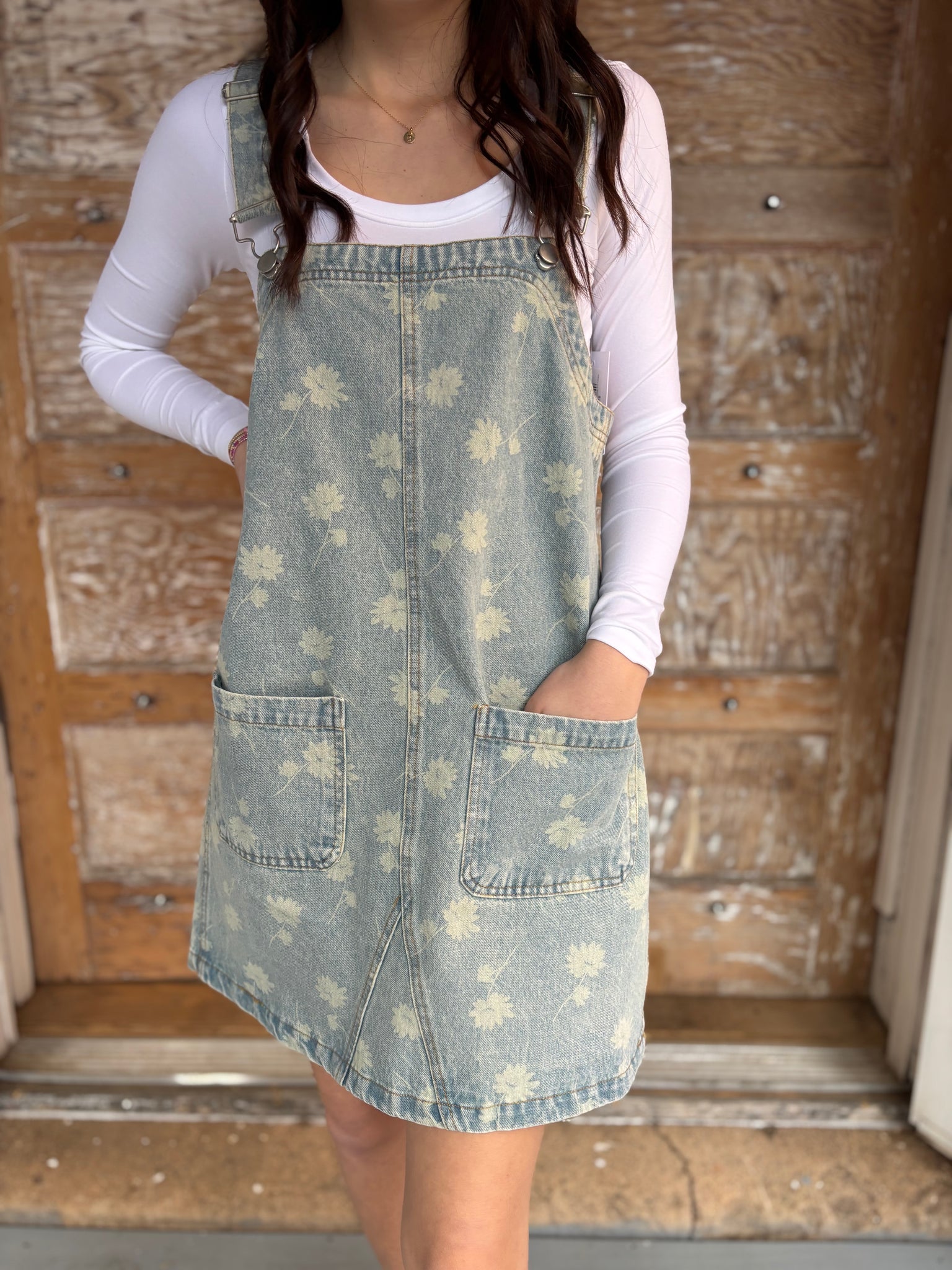 The Dandelion Overall Mini Dress is the perfect blend of playful and effortless style. Designed with a square neckline and sleeveless overall straps with latch closures, this floral washed denim dress features functional pockets and a flattering mini length. The soft, lightweight fabric is not lined, making it easy and comfortable for all-day wear. Due to the washed denim finish, tones may vary—giving each piece its own unique look.