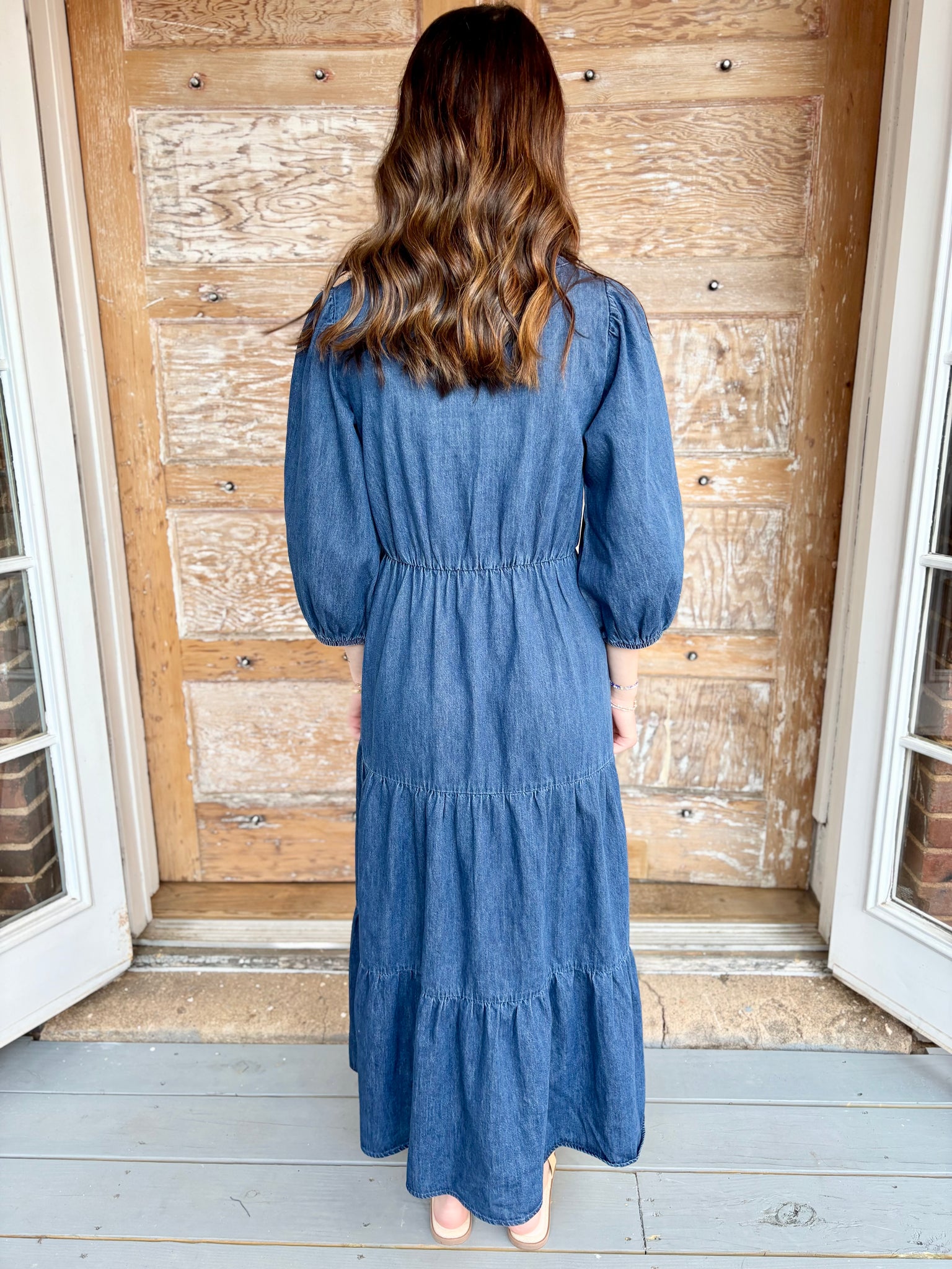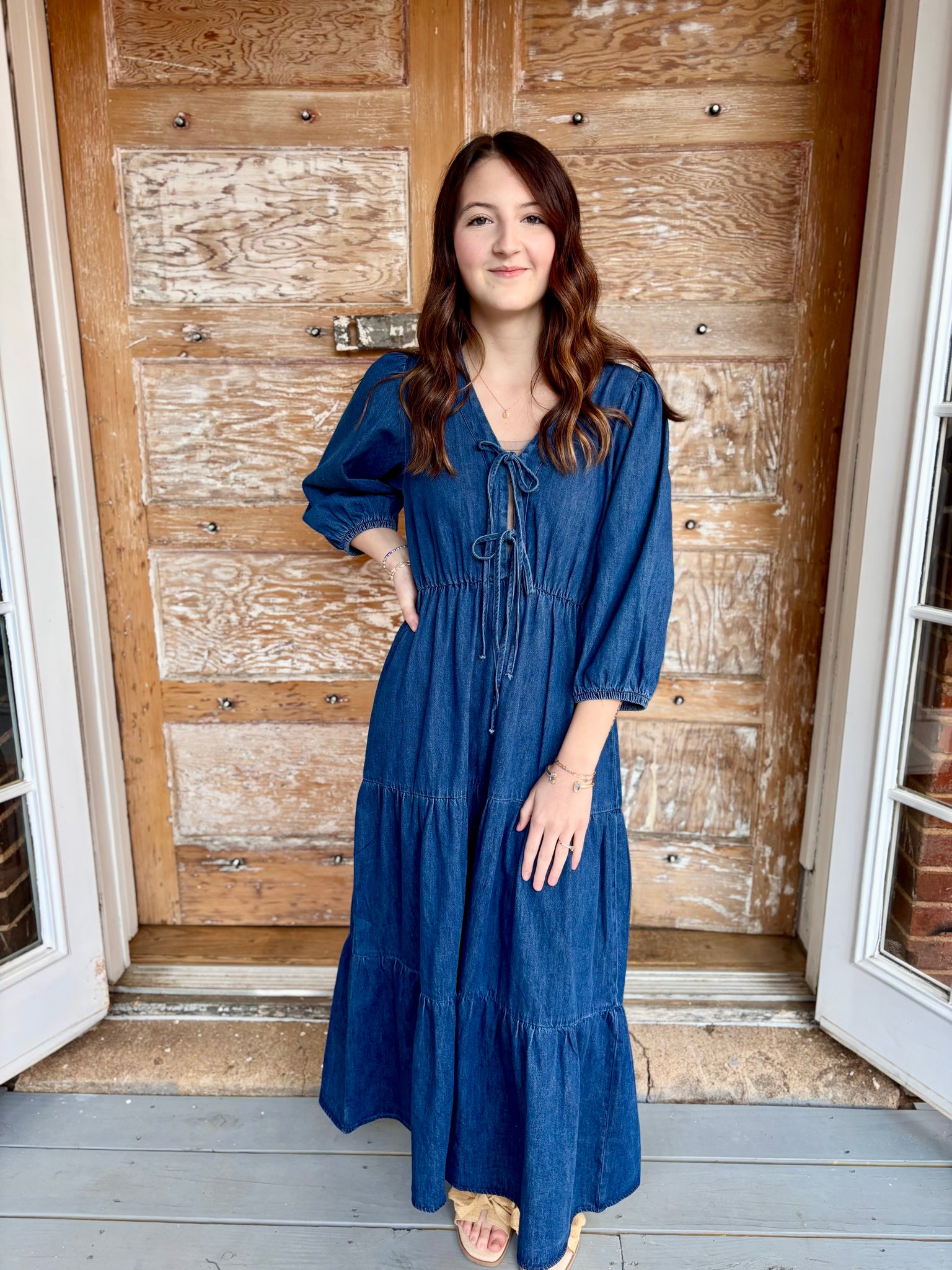 Meet your new go-to denim dress: the Vada Denim Tiered Midi Dress. Designed with a flattering V-neckline and double front tie detail, this dress blends casual charm with effortless femininity. The 3/4 sleeves with elastic cuffs add comfort and versatility, while the tiered silhouette creates beautiful movement and an easy, flowy fit.