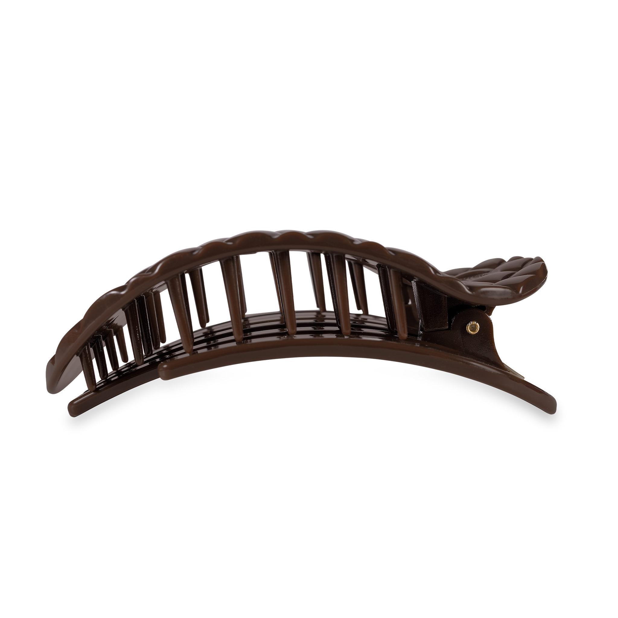 Lay flat and relax with the new TELETIES Truly Taupe Quilted Large Flat Round Hair Clip in Taupe. This hair clip is designed to allow you to lay back flat, do yoga, or sit comfortably in a seat with a headrest, and it is made with the same material that is nearly unbreakable.