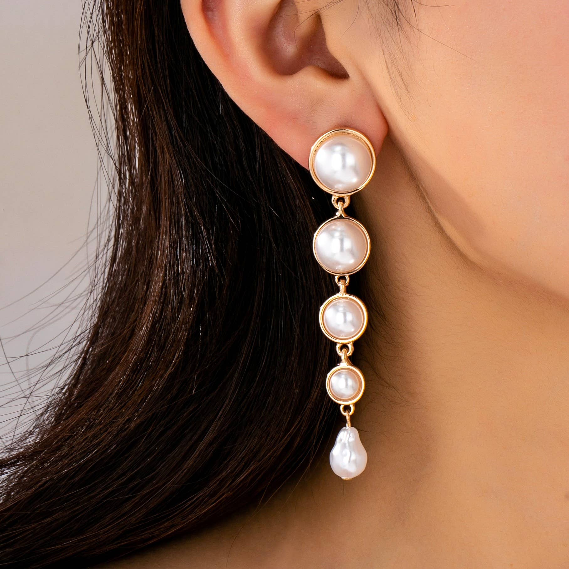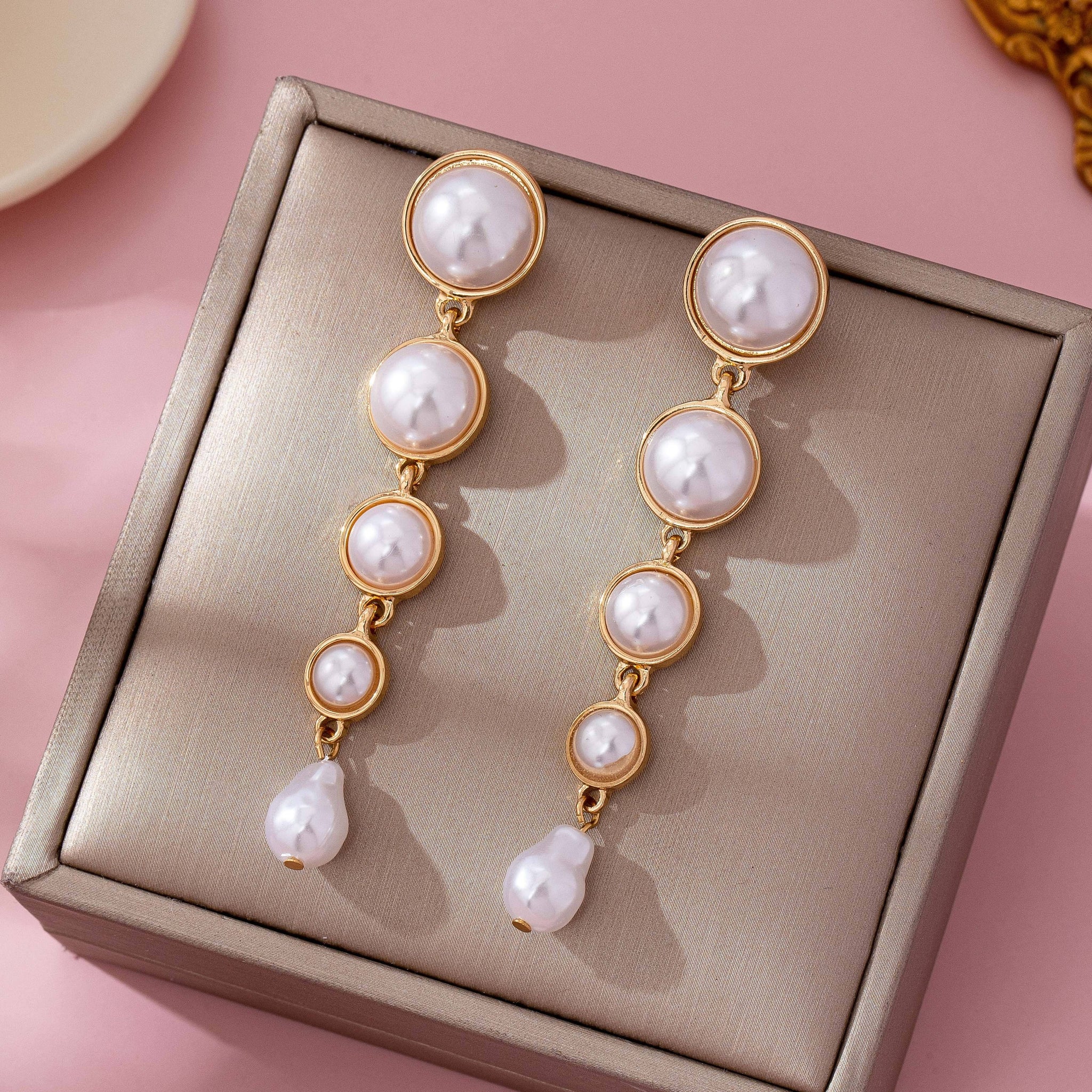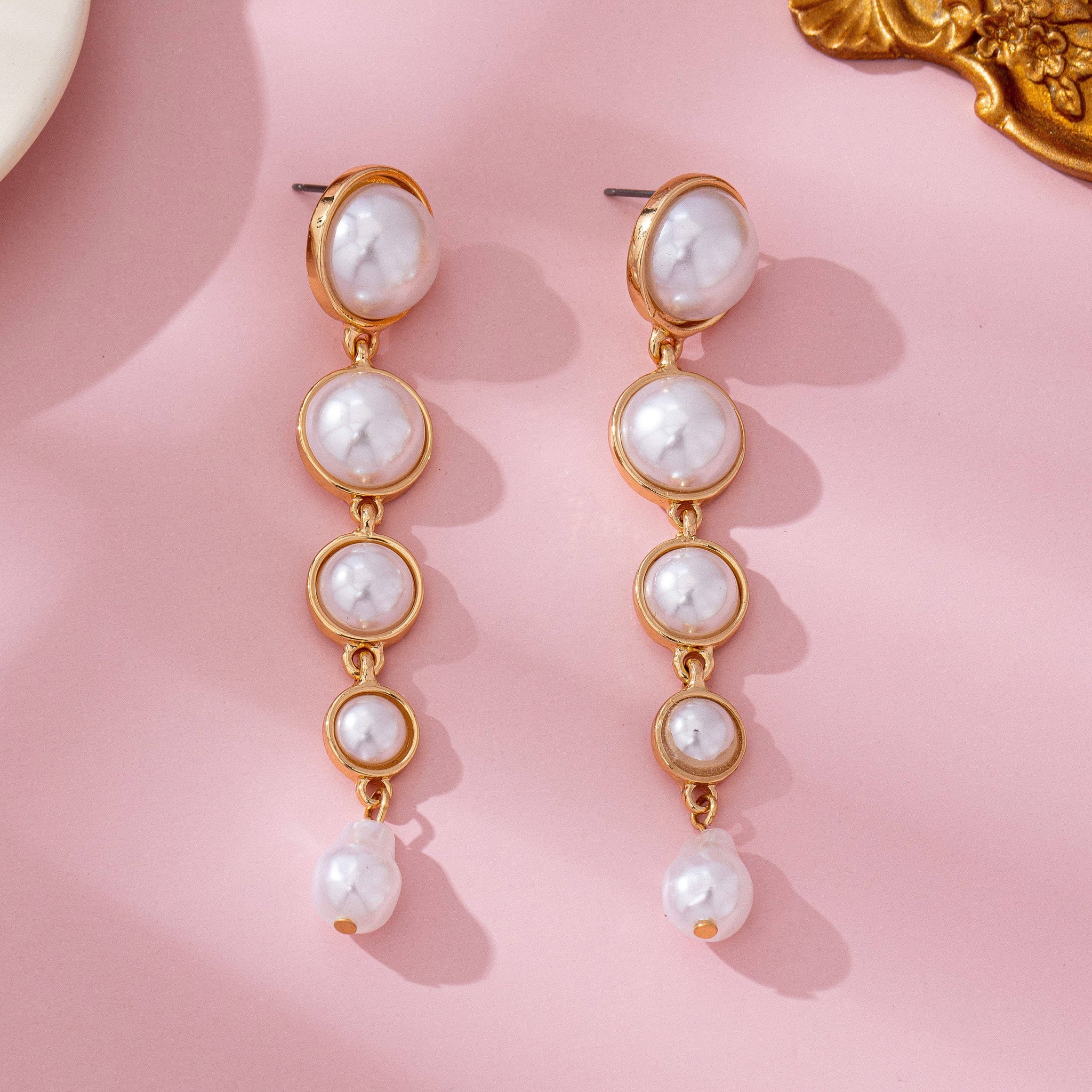 Gold-tone linear drops feature five linked heart-shaped stations, each cradling a luminous faux pearl within ornate scalloped frames. Cascading with vintage glamour and soft shine.