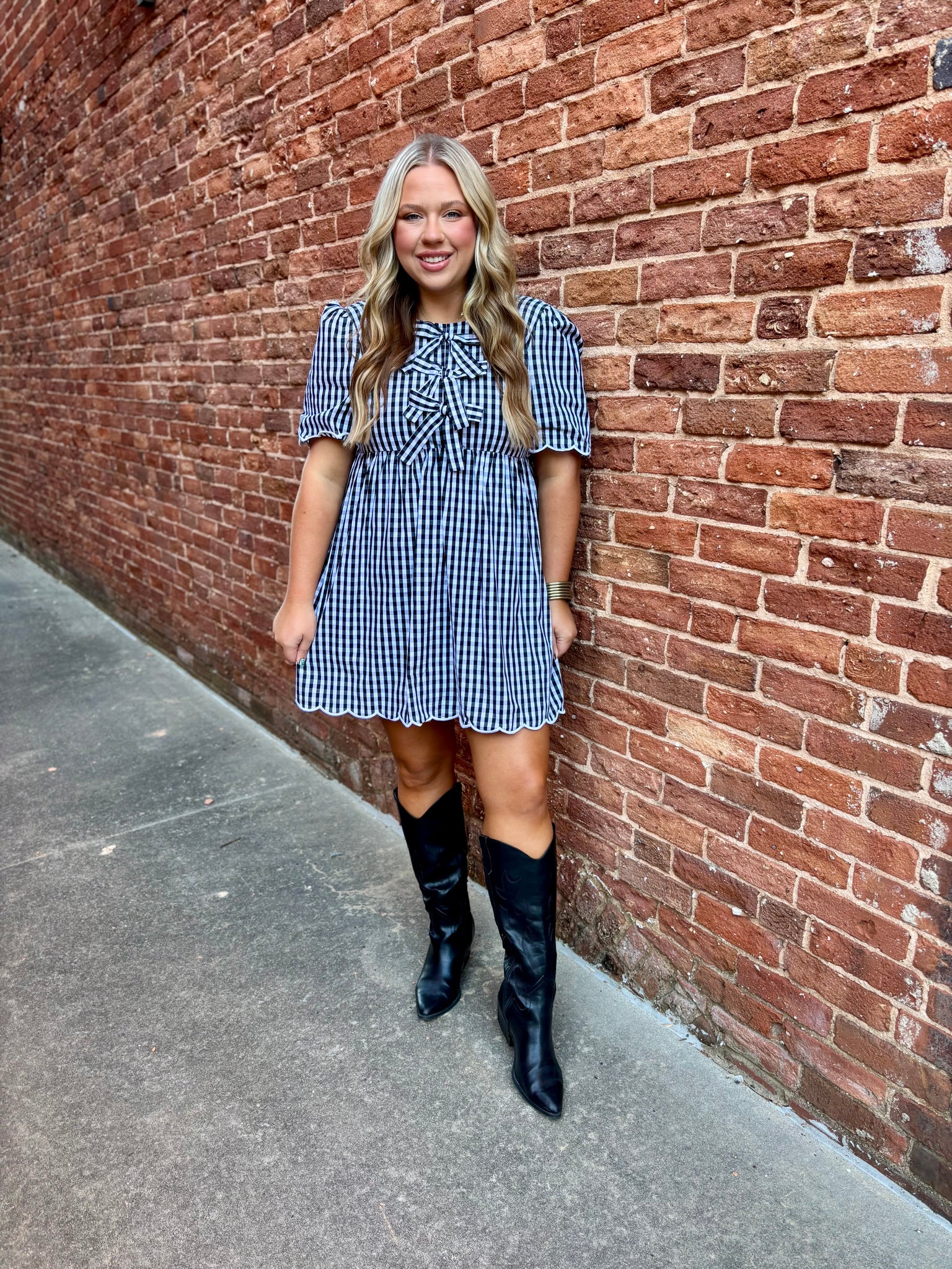 Plaid short sleeve dress with bow accent detail at center, side pockets and back concealed zipper. Model Size + Fit: Model height: 5'9" Dress size: Small Bust: 33 Waist: 25 Hips: 34