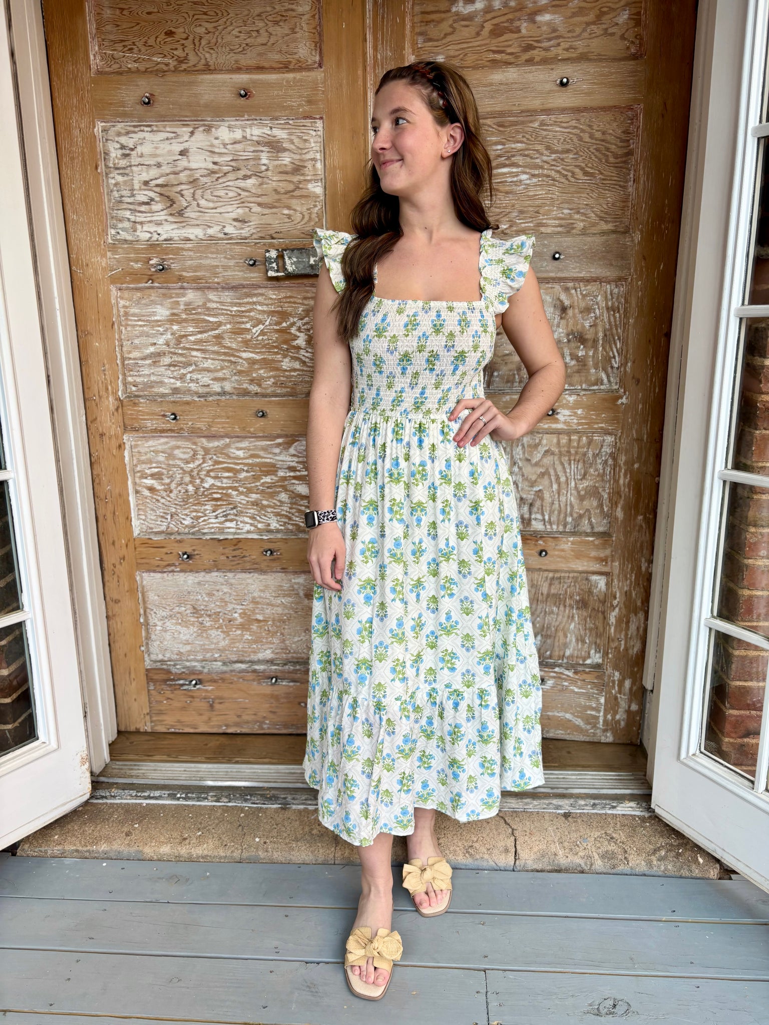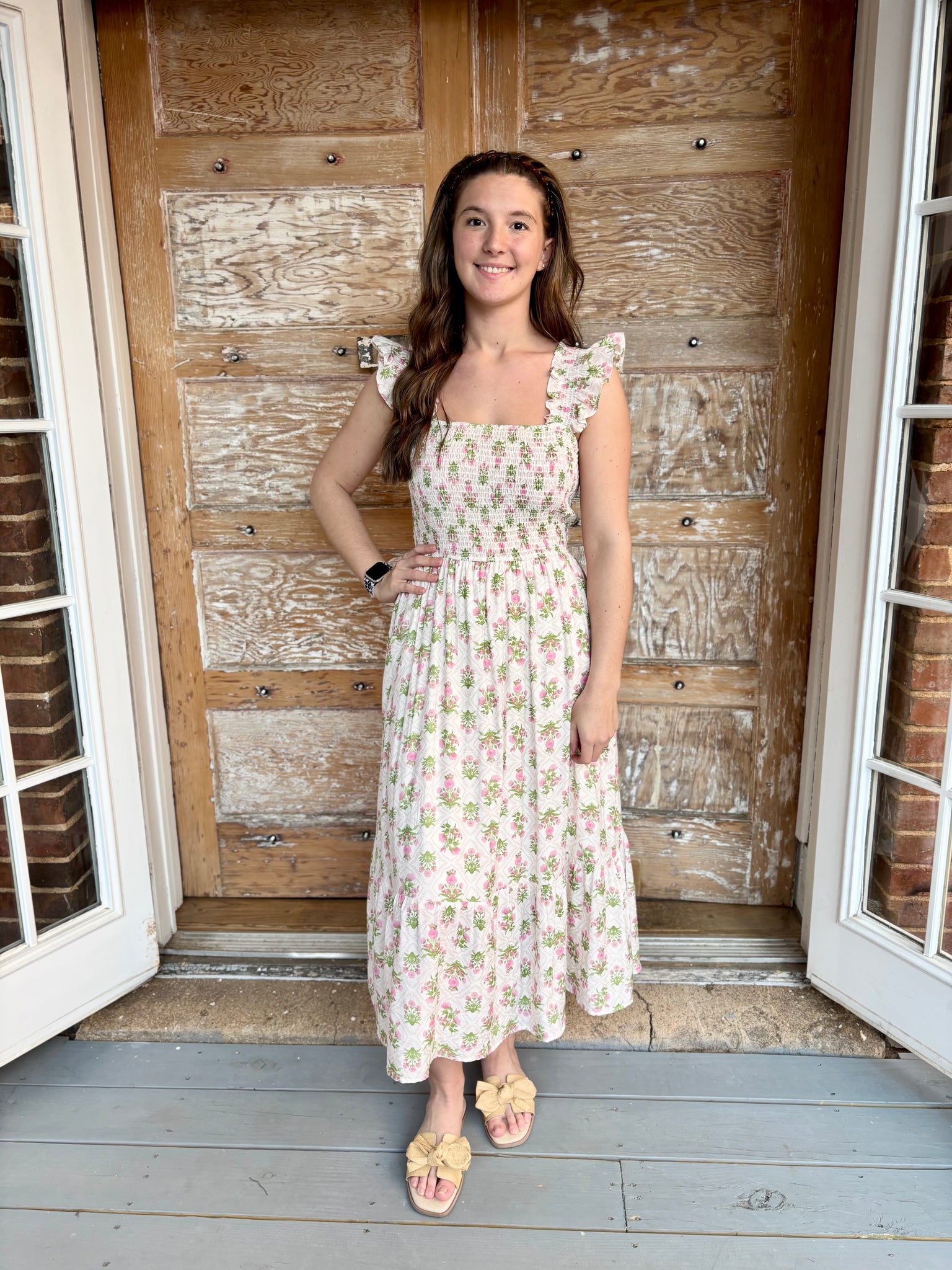 Say hello to effortless charm 🌸 The Campbell’s Smocked Midi Dress features a flattering square neckline and sleeveless silhouette with delicate elastic strap details finished with ribbon accents. The smocked bodice offers a comfortable, flexible fit while creating a beautifully feminine shape. A soft ruffle hem adds the perfect touch of movement, and the floral tile pattern makes this piece truly eye-catching.