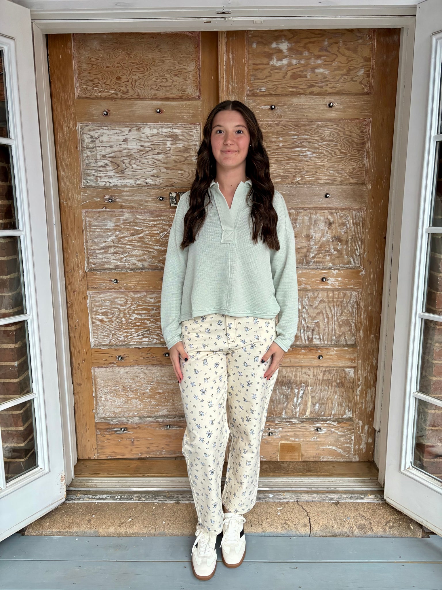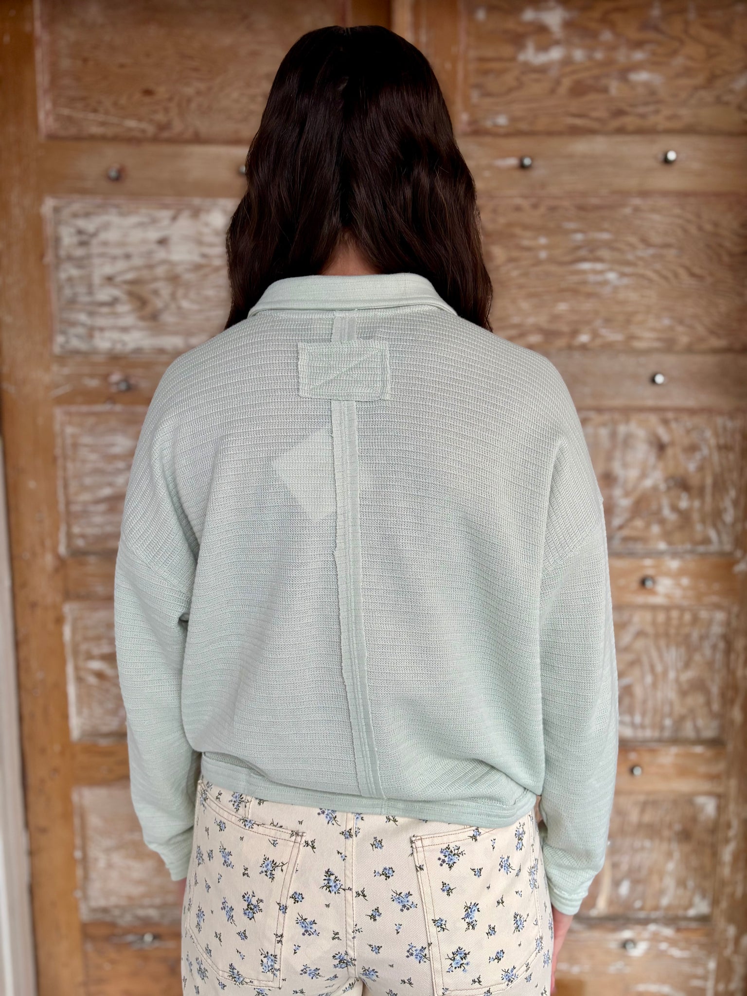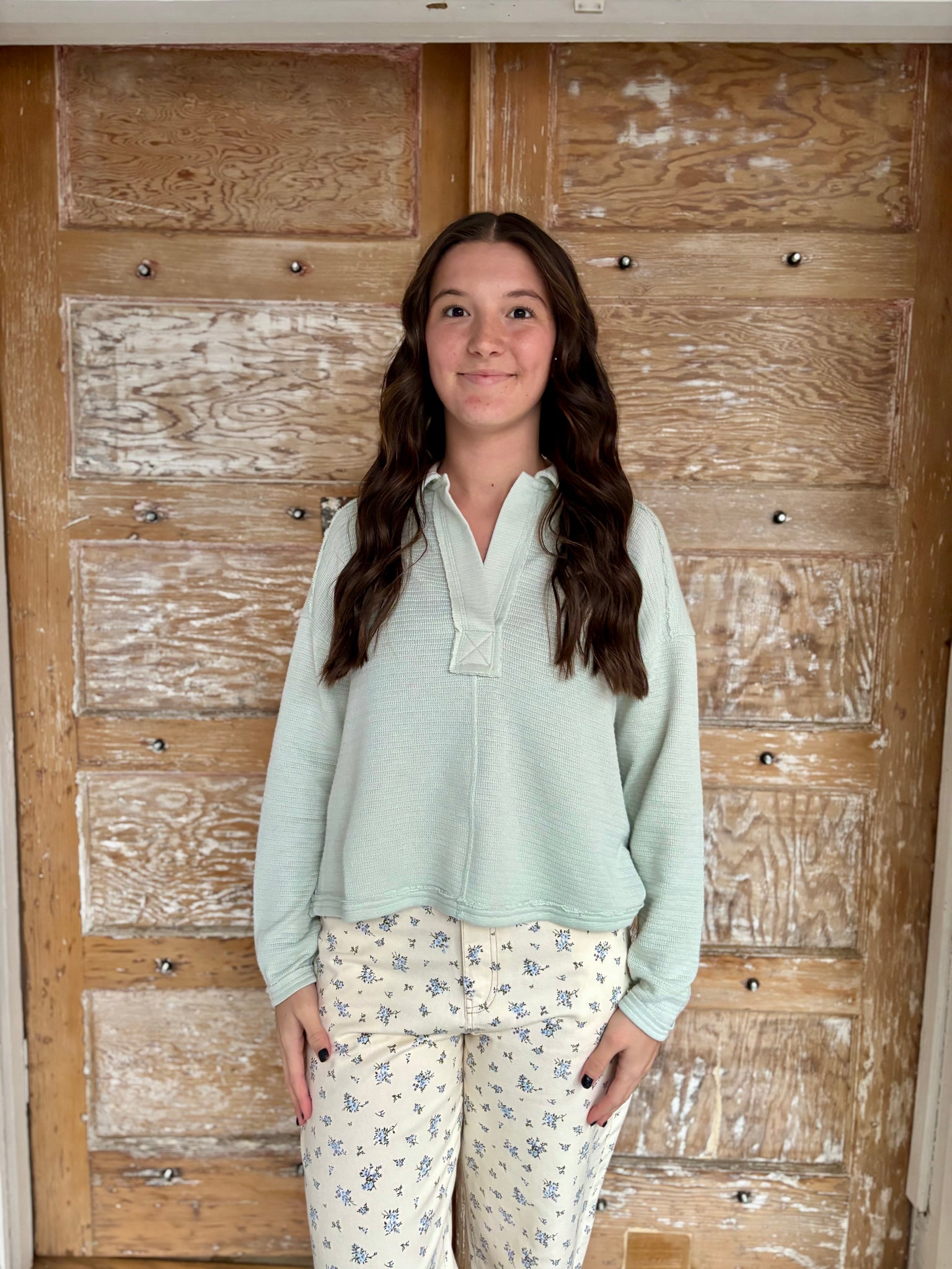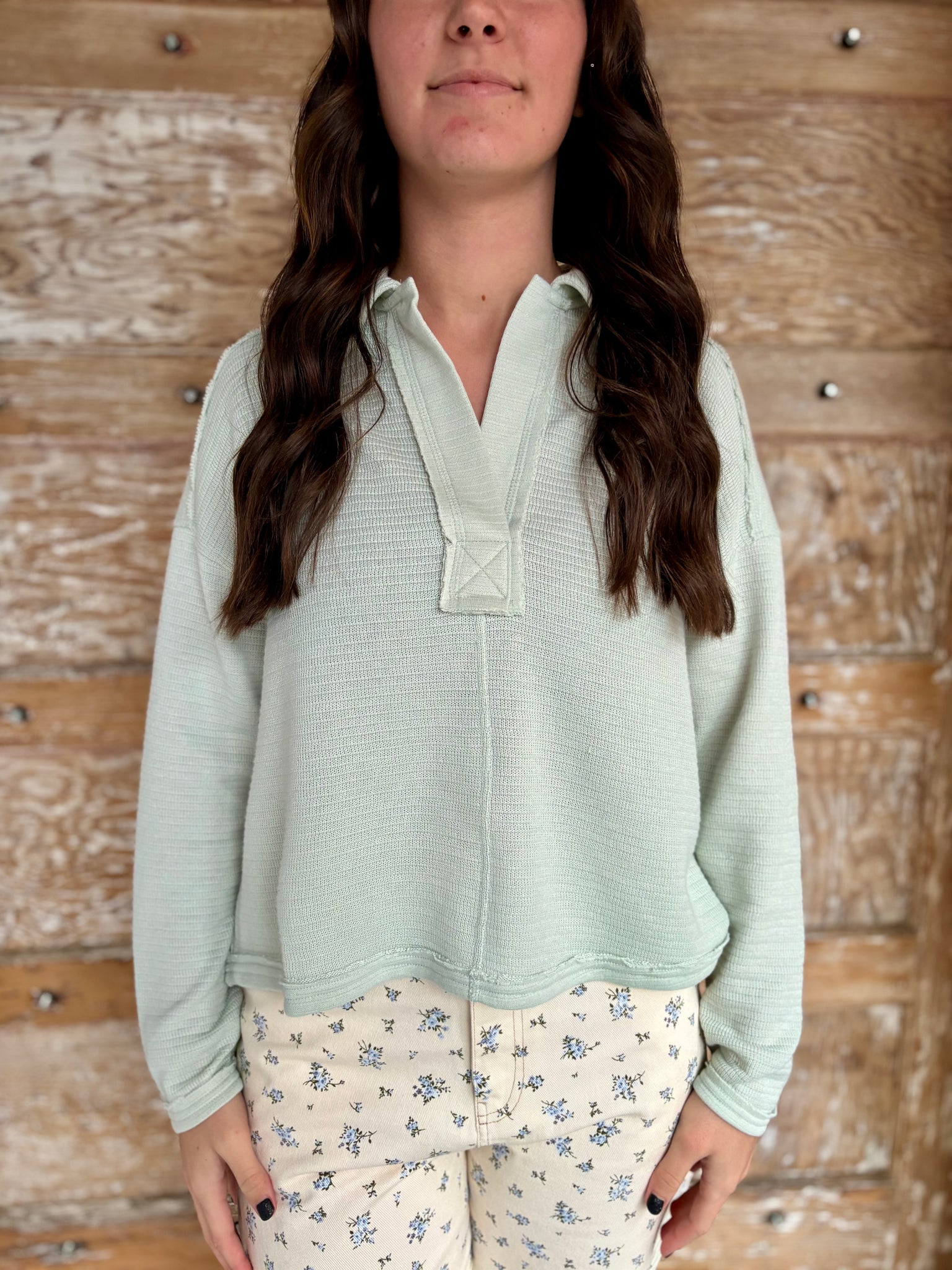 COLLARED V NECKLINE LONG SLEEVES DROP SHOULDER EXPOSED SEAM RAW EDGE RELAXED FIT NOT LINED KNIT TOP 67% POLYESTER 31% COTTON 2% SPANDEX
