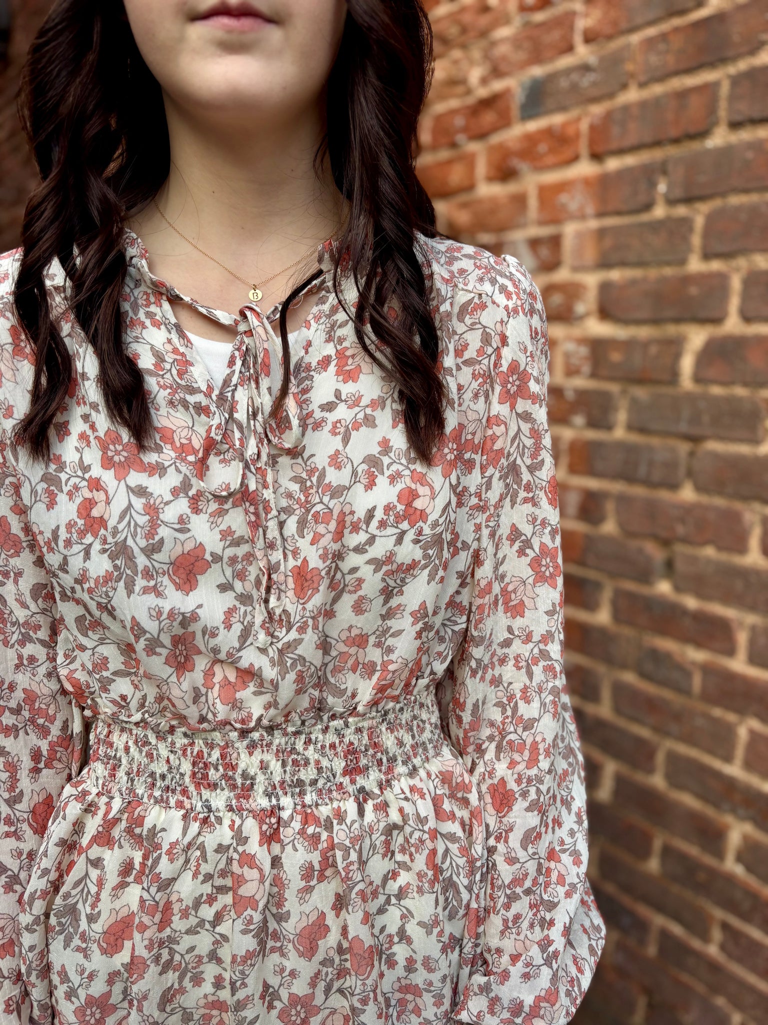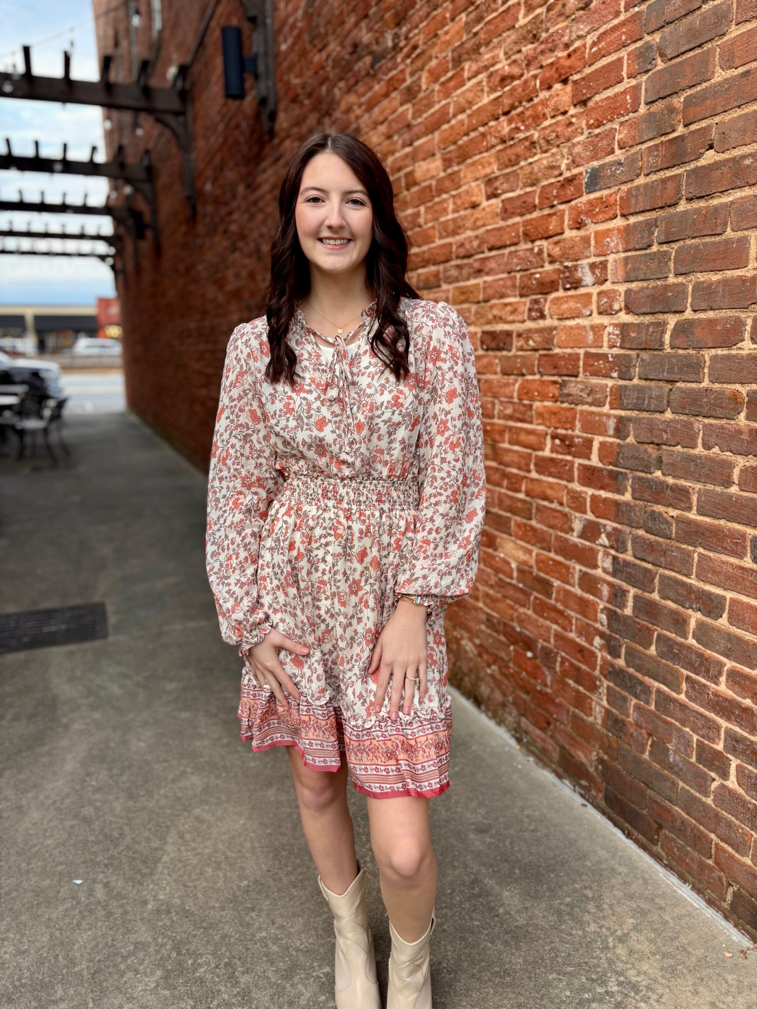 - SPLIT ROUND RUFFLE TRIM NECKLINE - FRONT SELF TIE WITH KEYHOLE - LONG SLEEVES WITH ELASTIC OPENING - SMOCKED WAIST WITH MINI RUFFLE DETAIL - RUFFLE HEM SKIRT - LINED - SHELL: 62% RAYON 38% POLYESTER - LINING: 100% POLYESTER
