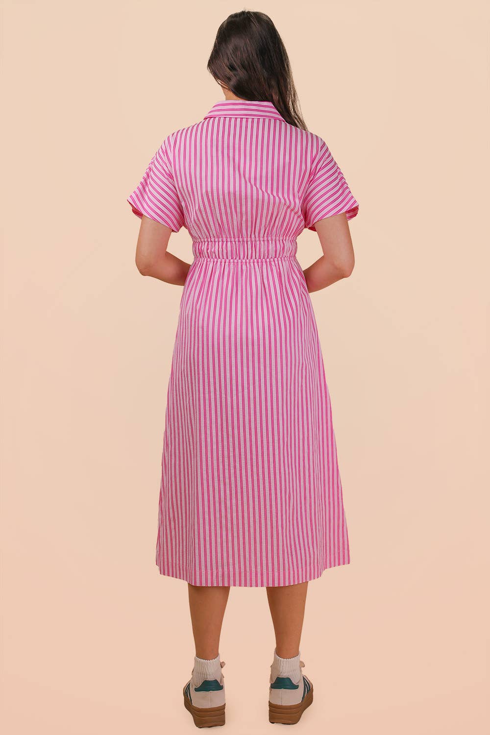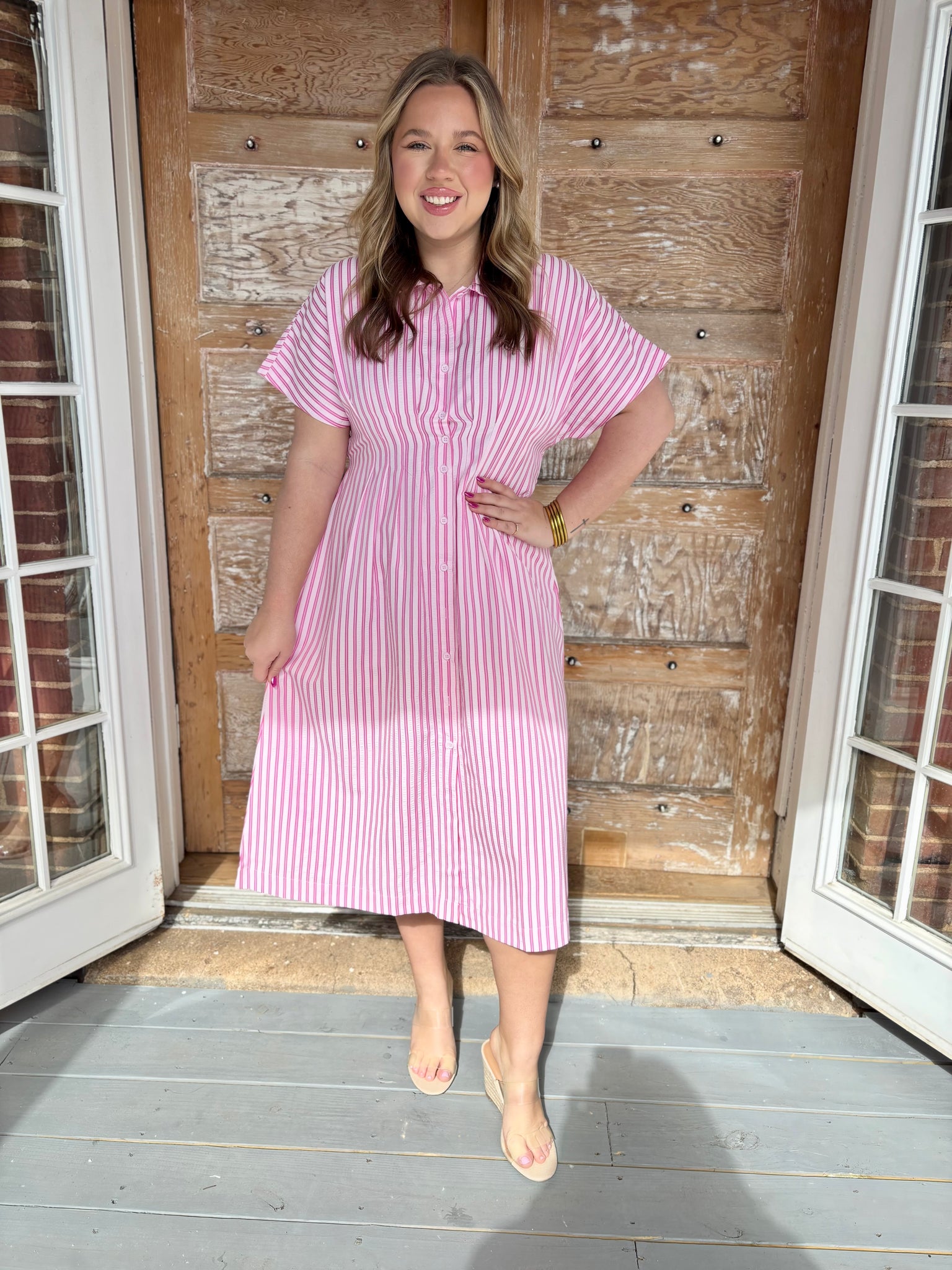 Meet your new go-to for effortless charm — striped to perfection. This pink and white beauty features a classic button-front design with a softly cinched waist for a flattering, feminine fit. The relaxed short sleeves and lightweight feel make it an easy choice for everything from brunch dates to spring celebrations.