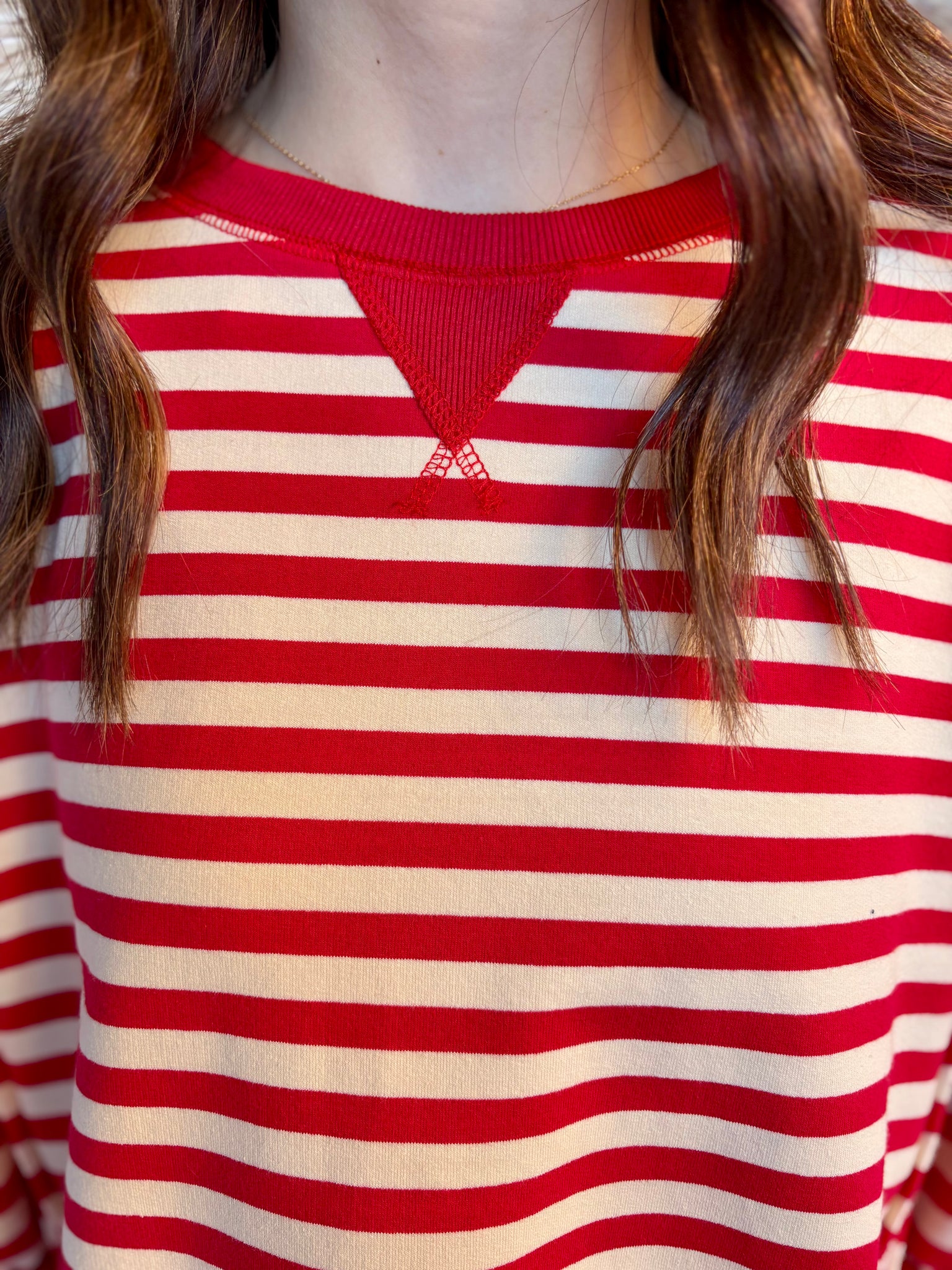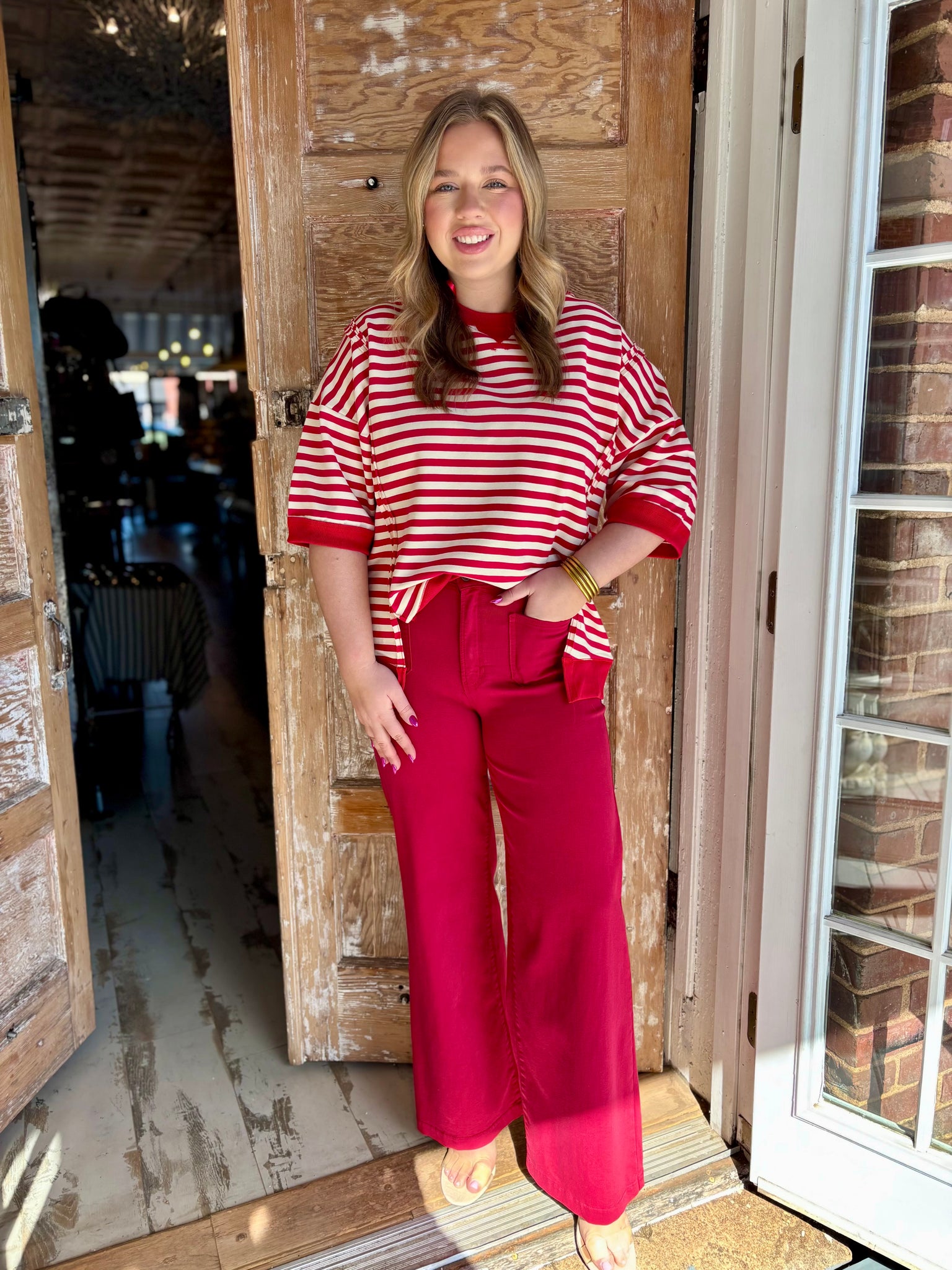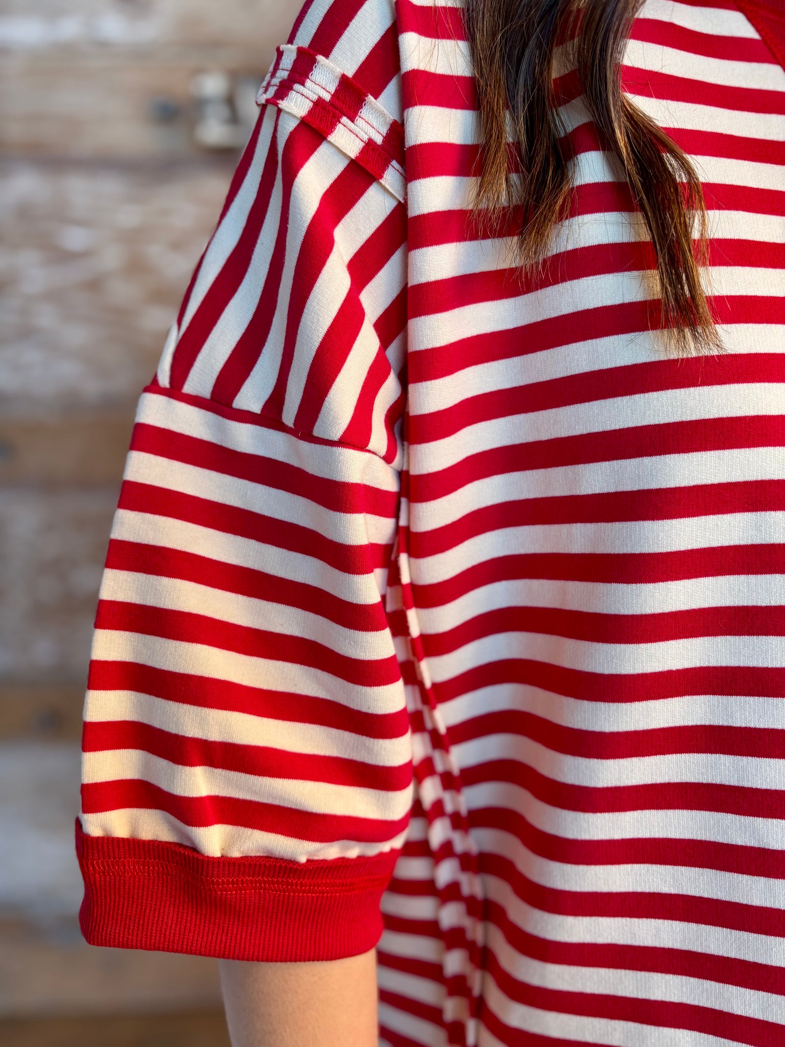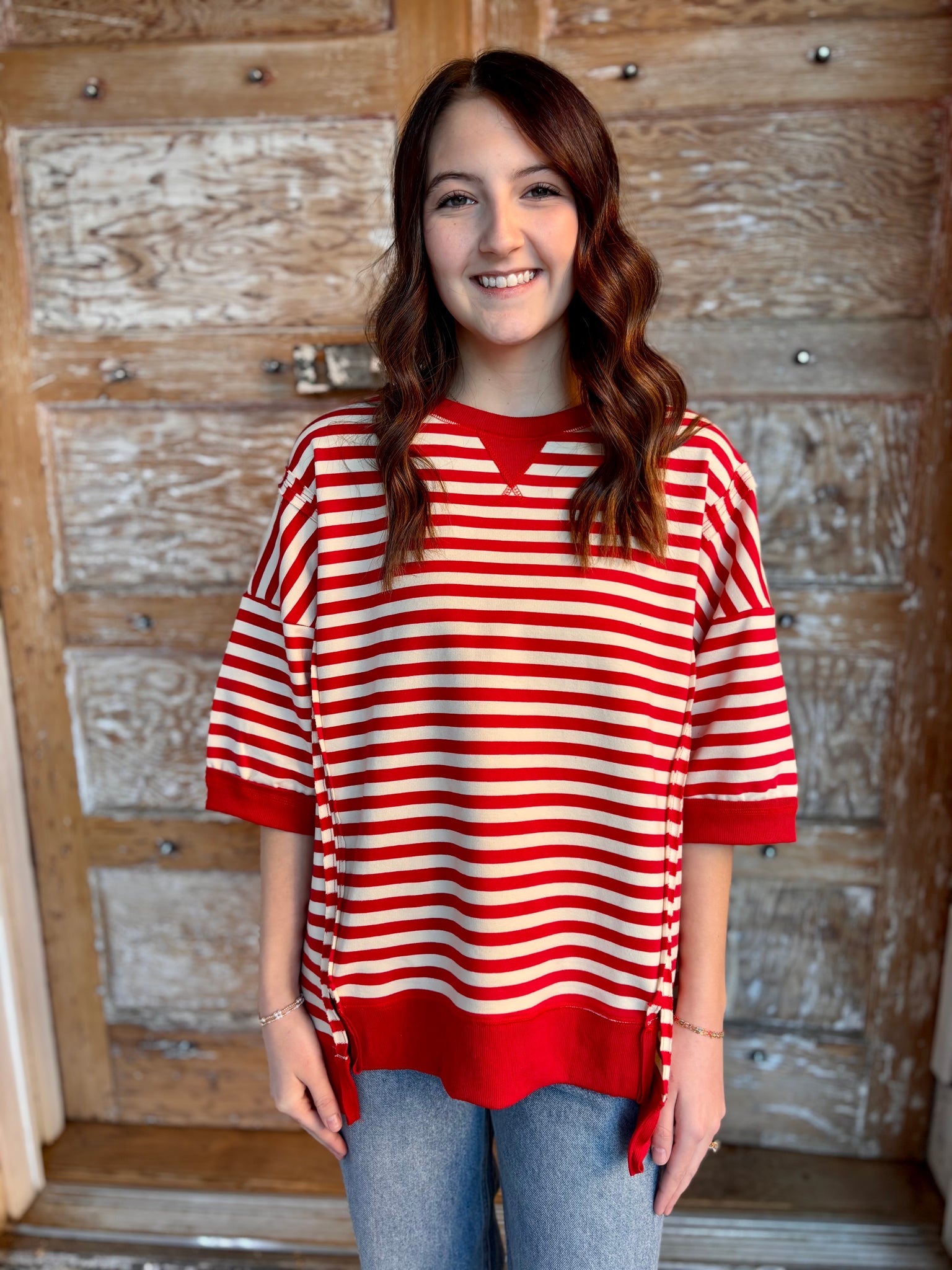 Meet your new go-to for effortless, everyday style with a Valentine’s twist! The Gwen Side Slit Oversized Top features bold red and cream stripes in a relaxed, oversized fit that’s made for comfort and cute factor. Designed with a classic round neckline, drop shoulders, and short sleeves, this top gives you that perfectly slouchy, easygoing vibe.