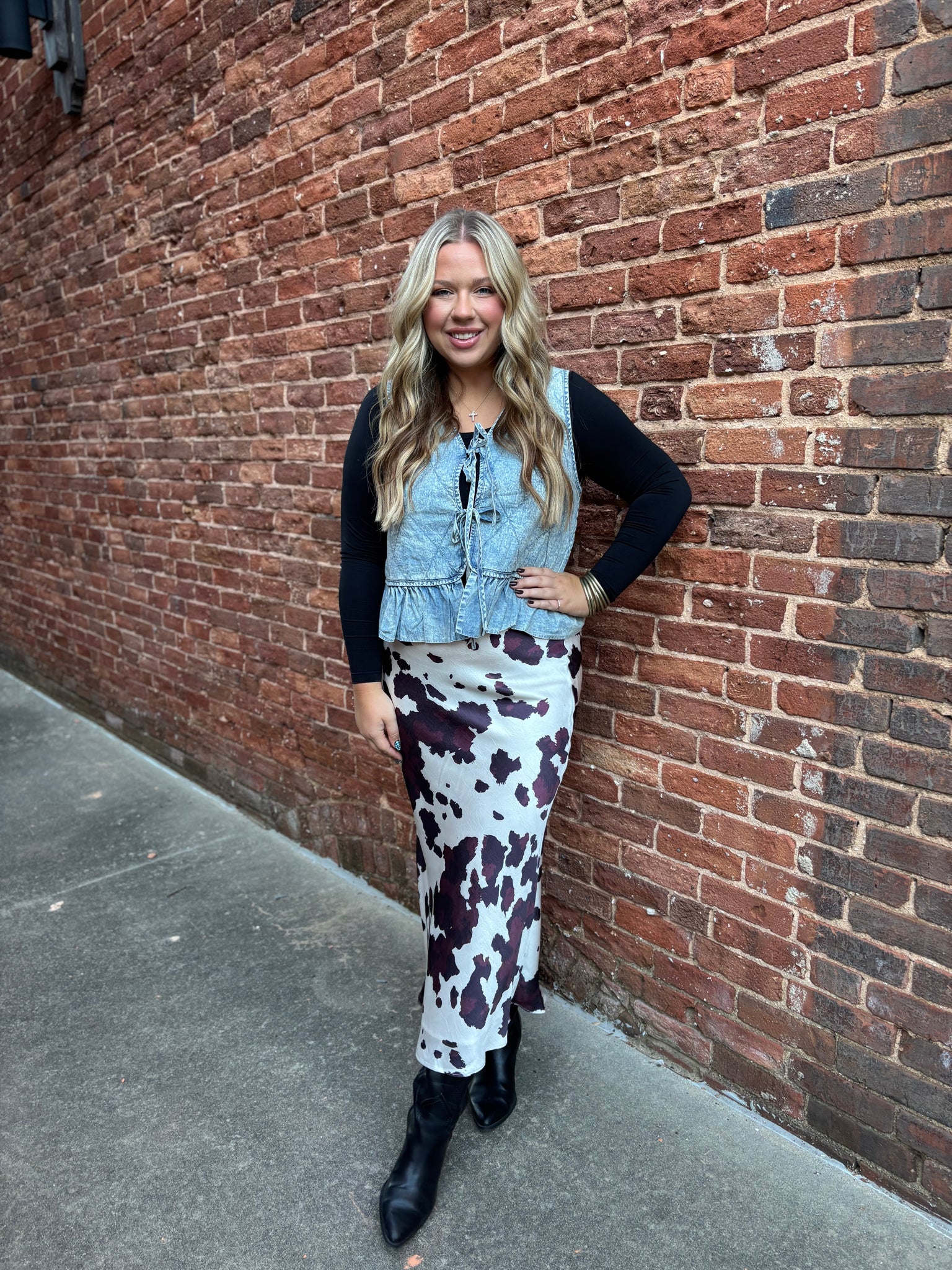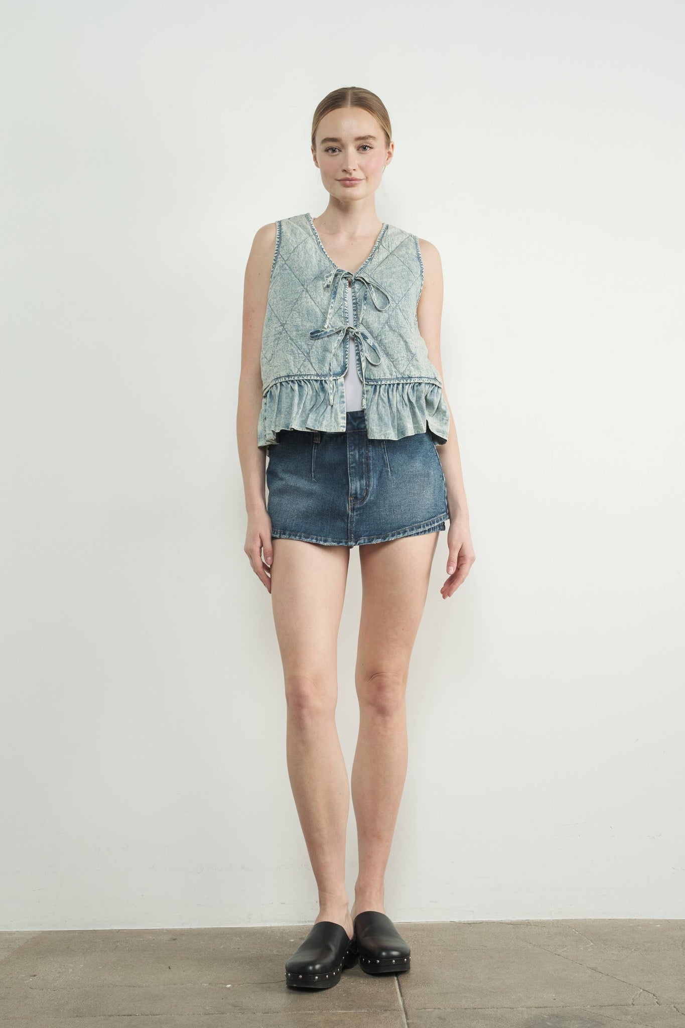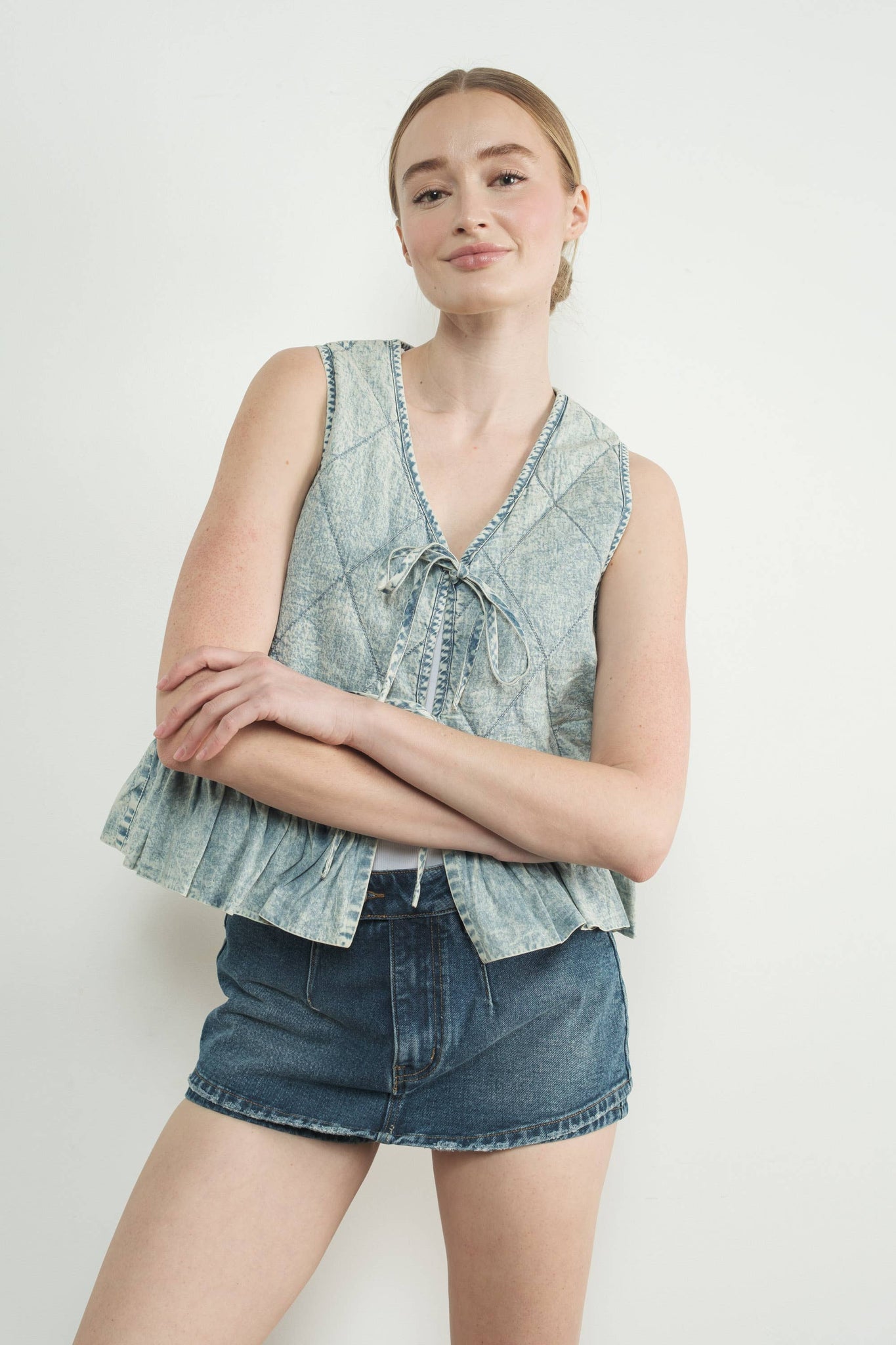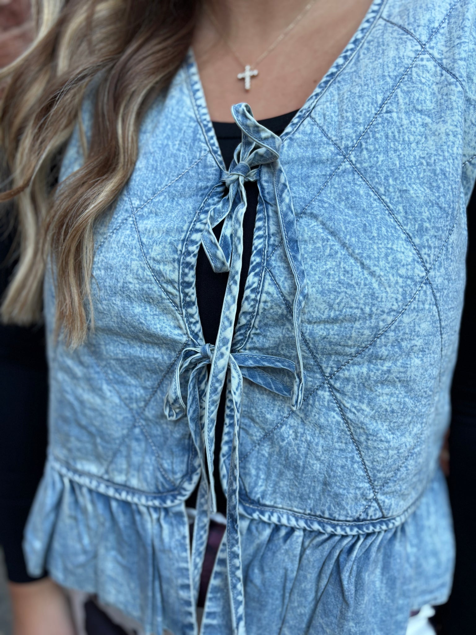 Add a touch of vintage charm to your wardrobe with this denim vest. Featuring a quilted pattern and a flattering V-neckline, The tie-front closure and ruffled hem add playful, feminine details, while the washed denim finish enhances its retro vibe. -Quilted pattern with a V-neckline -Tie-front closure and ruffled hem
