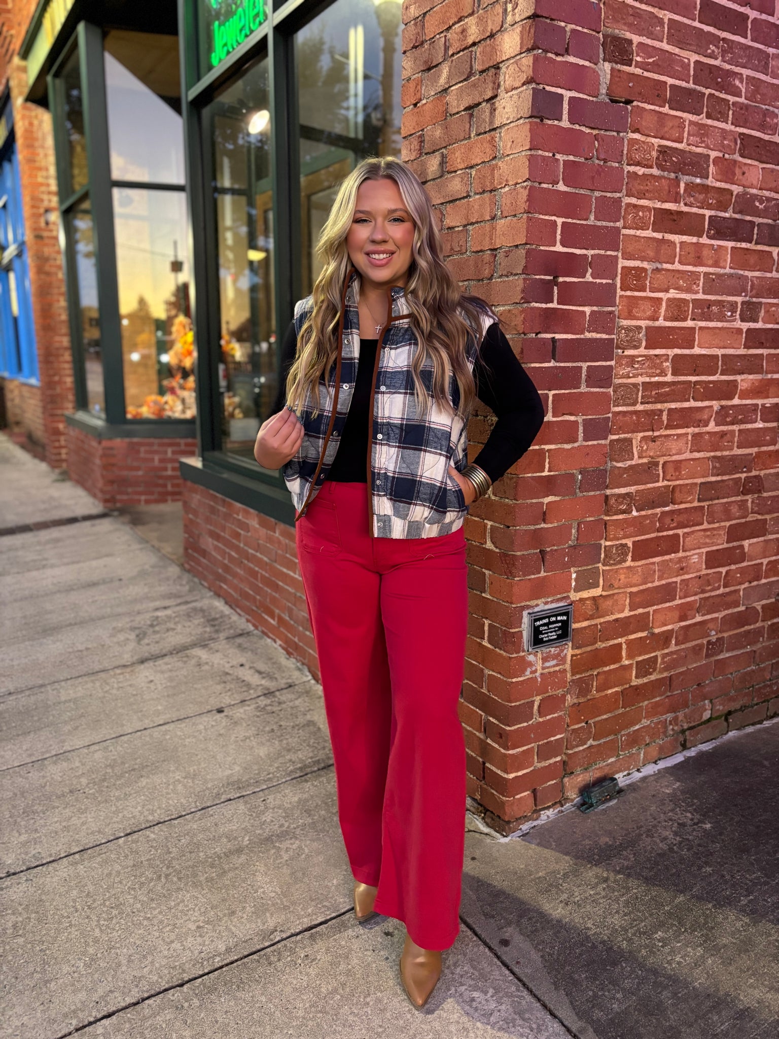 Step out in style with the THML Around Town Plaid Puffer Vest — the perfect blend of cozy comfort and effortless charm. Featuring a classic navy and cream plaid pattern with warm brown trim, this lightweight puffer vest adds a touch of timeless flair to any outfit. Designed with a flattering fit and soft quilted texture, it’s ideal for layering over your favorite long sleeve tops or sweaters. Whether you’re heading downtown for a casual day out or enjoying a weekend getaway, this vest keeps you warm while looking chic.