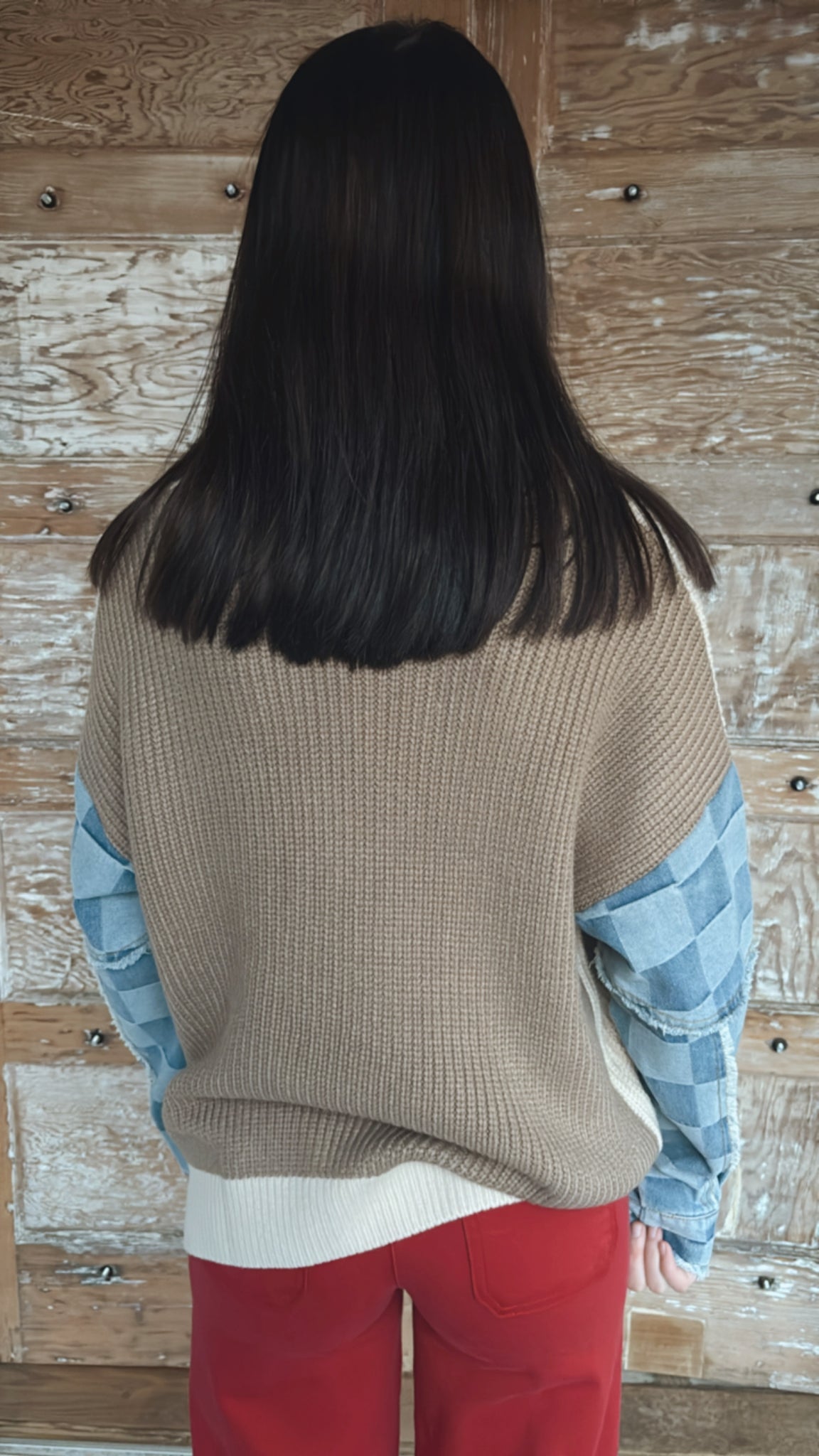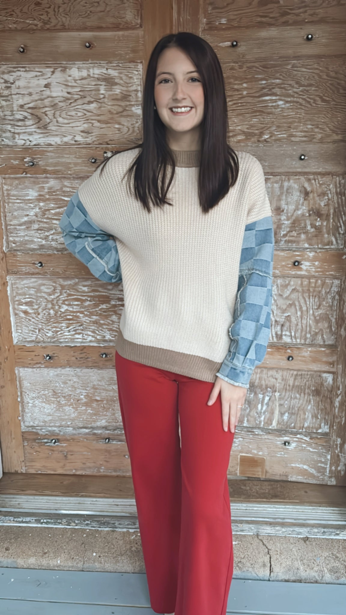 The Dalia Sweater blends classic comfort with standout style. Its soft, textured knit body in a warm cream tone offers an easy, relaxed fit perfect for everyday wear. Playful, patchwork-style denim sleeves bring a unique contrast, adding character and a modern, artsy touch to the look. Finished with a subtly ribbed neckline, cuffs, and hem, this sweater pairs effortlessly with both casual and bold bottoms.