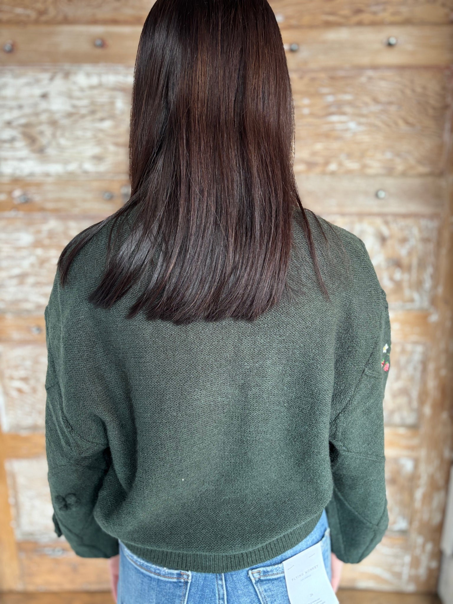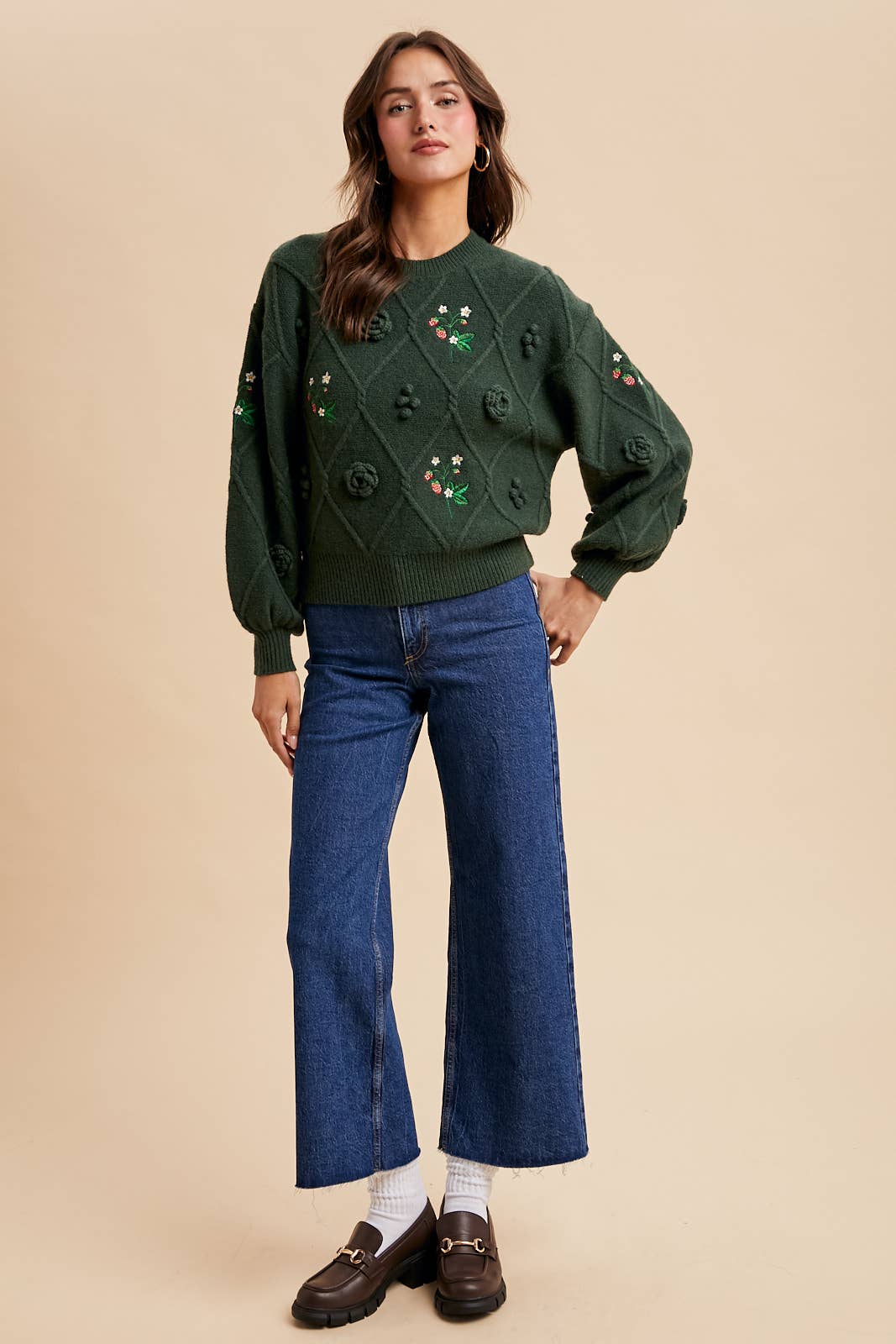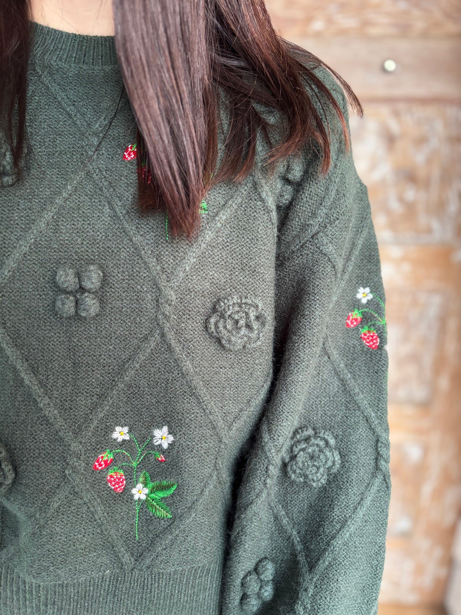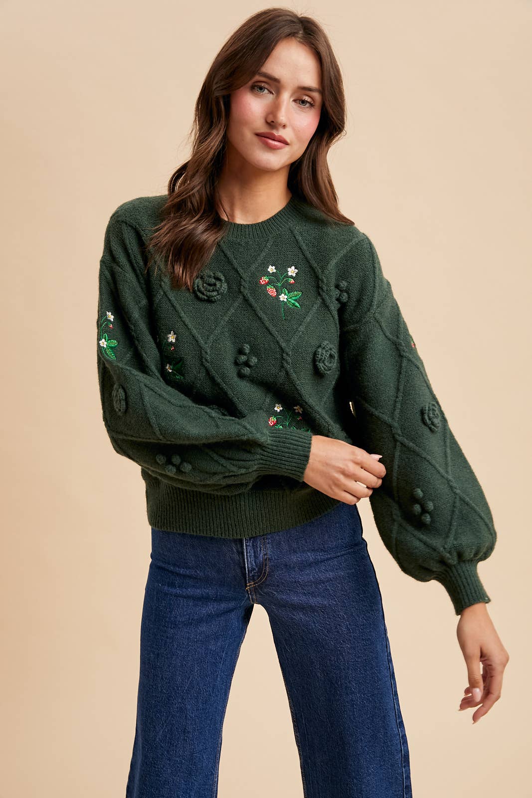 DARLING CABLE KNIT SWEATER FEATURES 3D APPLIQUE ROSETTES AND POM DETAIL ALONG WITH A STRAWBERRY FLORAL EMBROIDERED MOTIF. ALSO INCLUDES RIBBED NECK, BANDING AND SLEEVE ENDS.