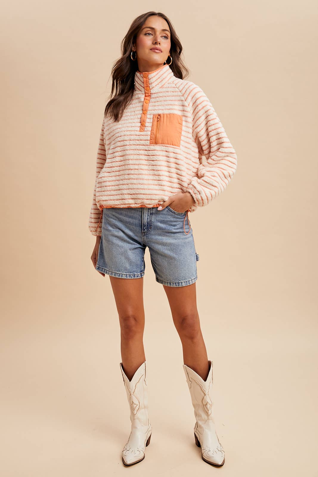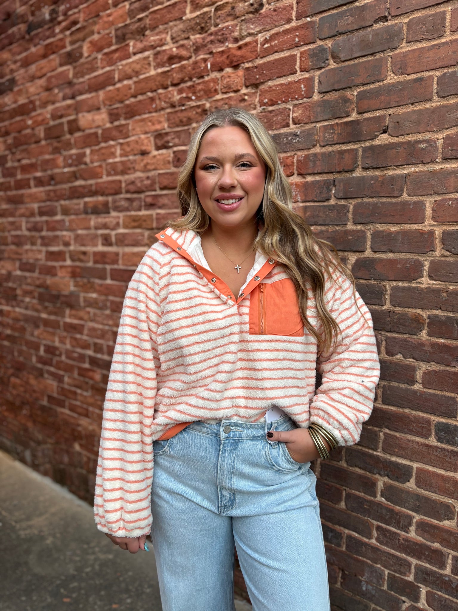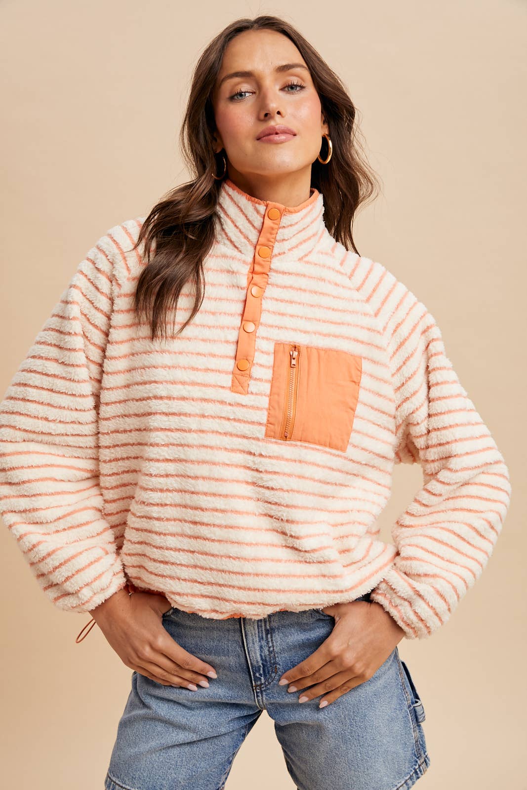 COZY STRIPED PULLOVER FEATURING: - FUZZY MICROFIBER STRIPED FABRICATION - METAL SNAP BUTTON CLOSURES - CONTRAST BINDED ACCENTS - ZIPPERED POCKET - ELASTIC BOTTOM WITH TOGGLE DRAWSTRING - FULLY LINED WITH COTTON LINING
