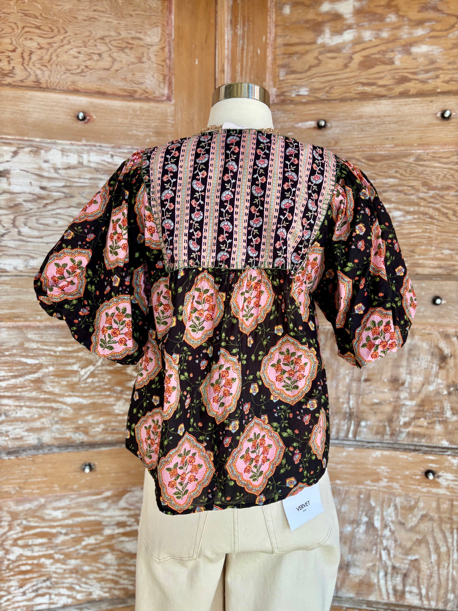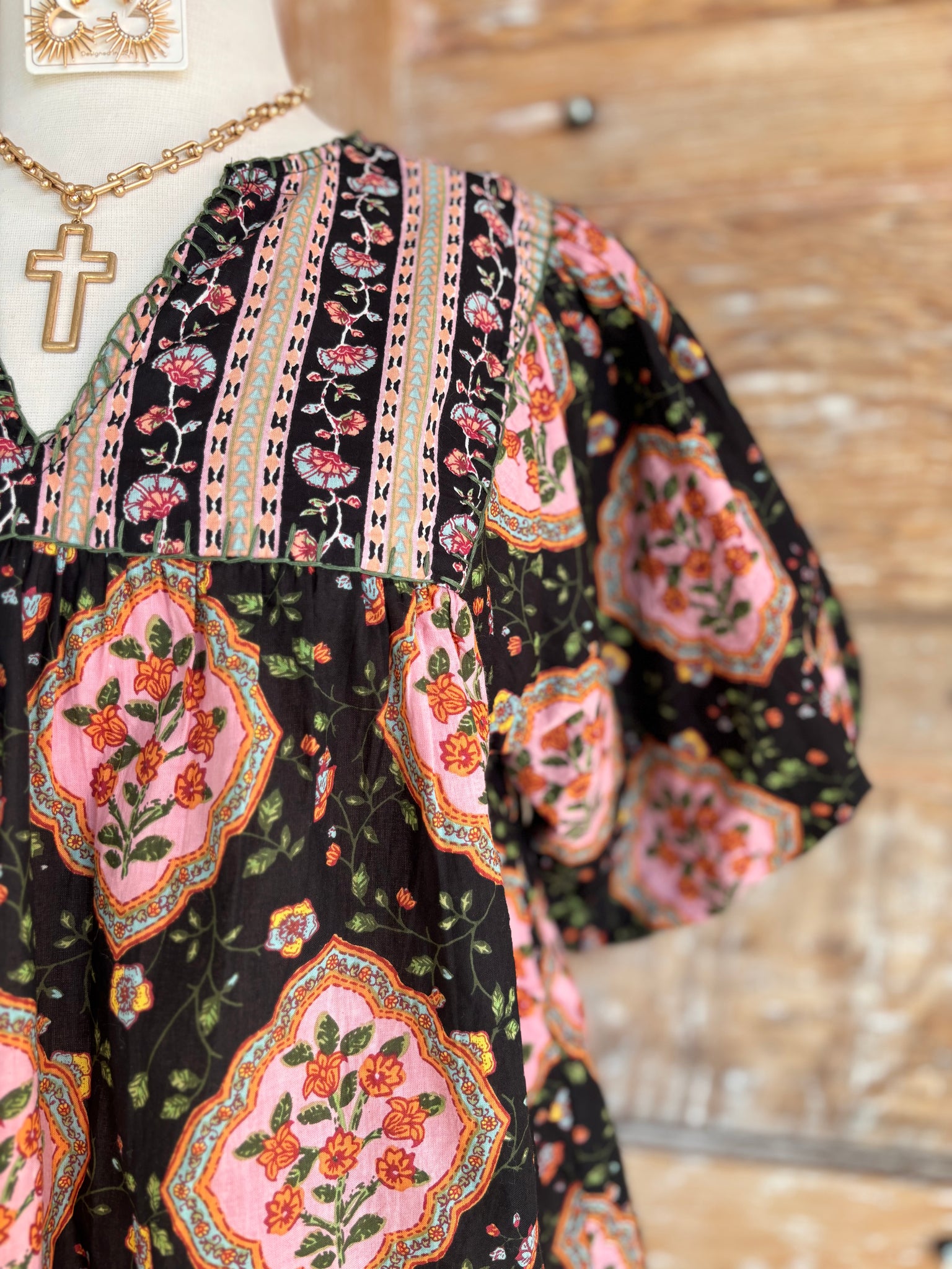 The Starlit Florals Top brings timeless elegance with a playful, feminine twist. Set against a rich black background, delicate floral prints dance across the fabric, creating a chic, eye-catching pattern. Puff sleeves add volume and romance, while a flattering neckline keeps it effortlessly wearable. Lightweight and breezy, this top pairs beautifully with high-waisted jeans, skirts, or tailored trousers — perfect for brunches, date nights, or boutique-worthy everyday style. Add your favorite heels or ankle boots to complete a look that feels polished yet whimsical.
